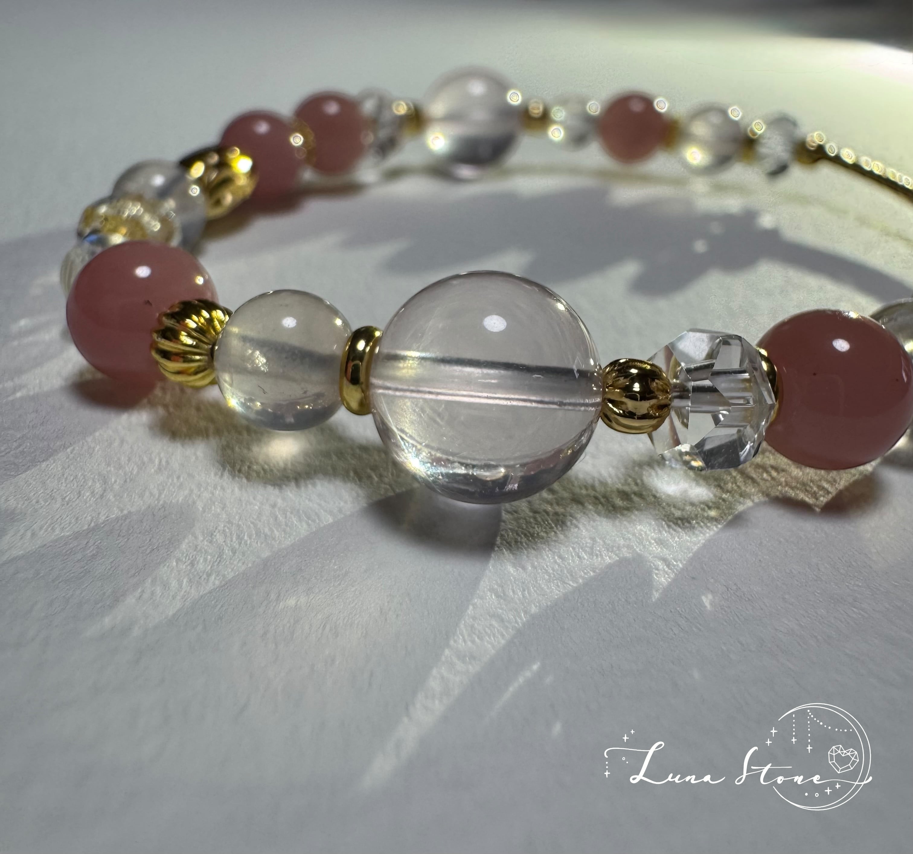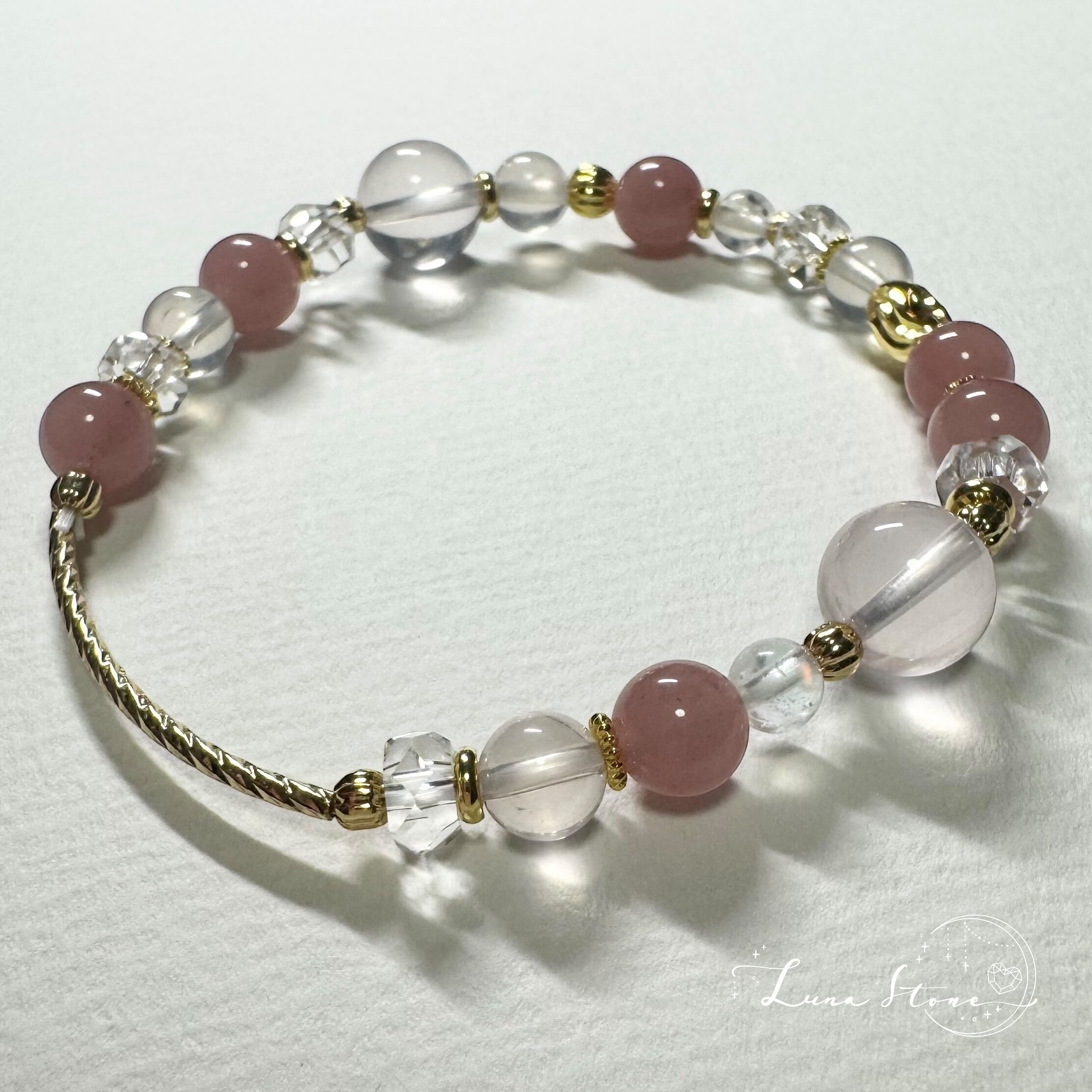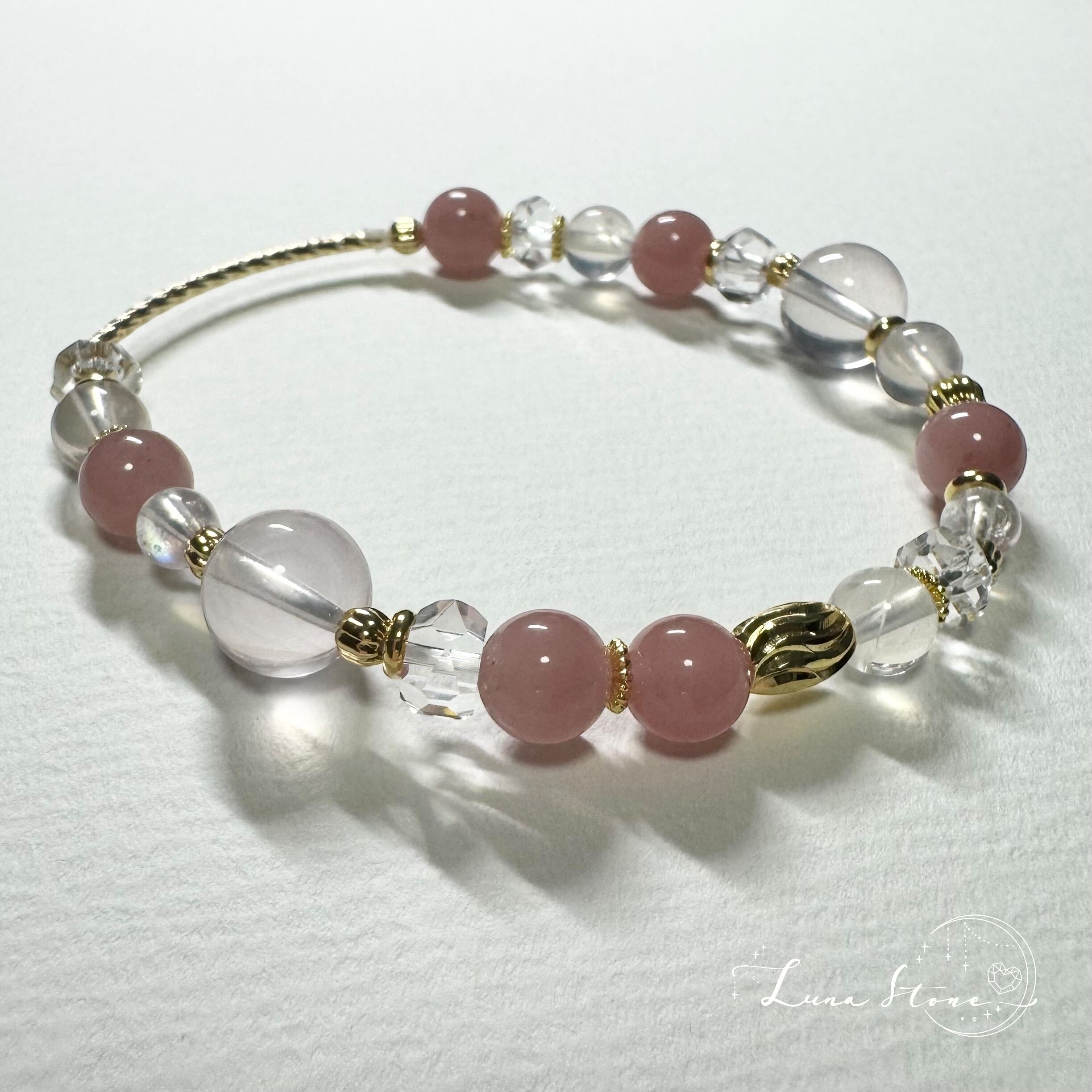 グァバクォーツの可愛らしいピンクと、スターローズクォーツの優しい光が手元をやわらかく彩ります。