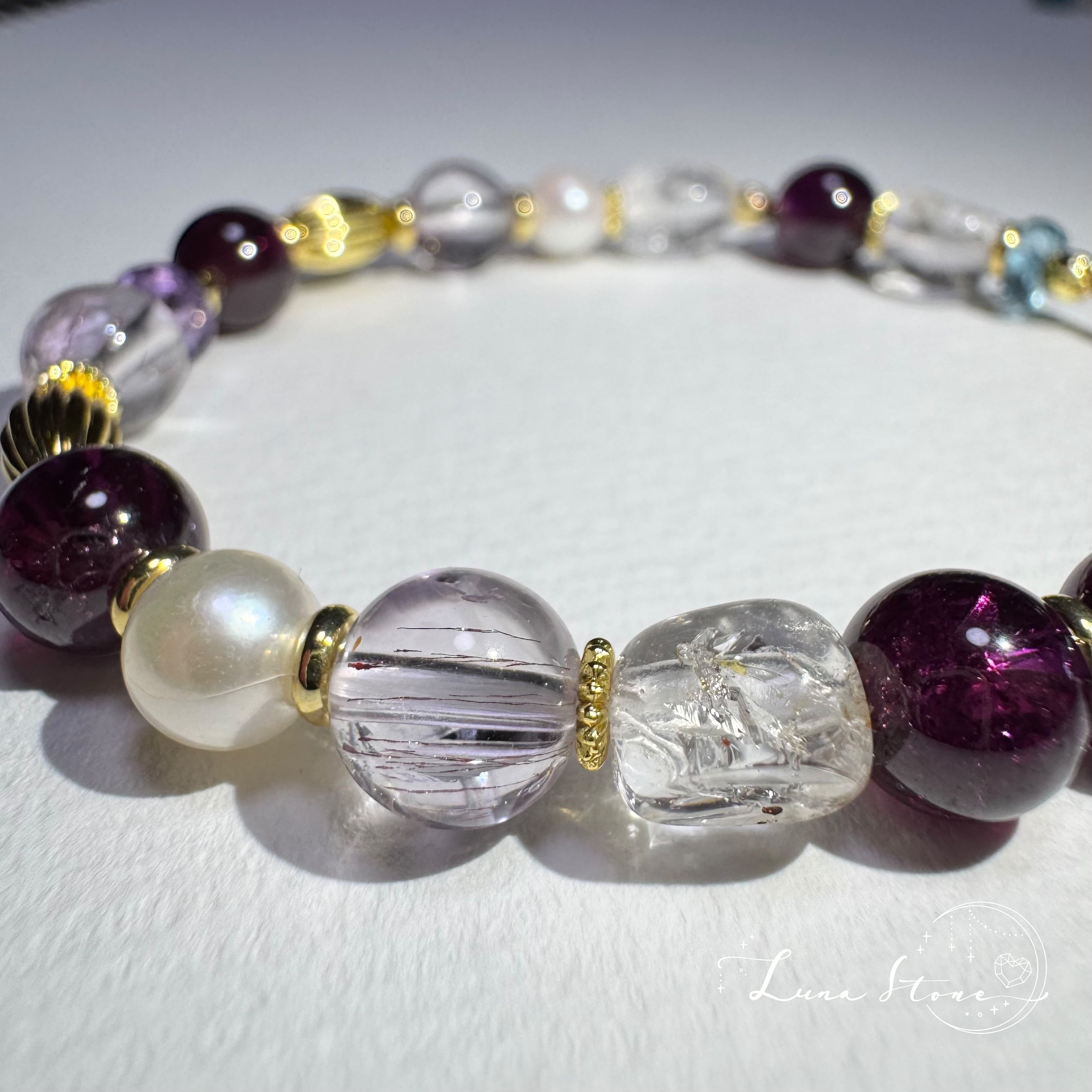 幻想的な光を宿すスーパーセブン、内包物の揺らめきが魅力的なオイルインクォーツ、深みのあるロンドンブルートパーズに、優雅な光沢を放つあこや真珠──