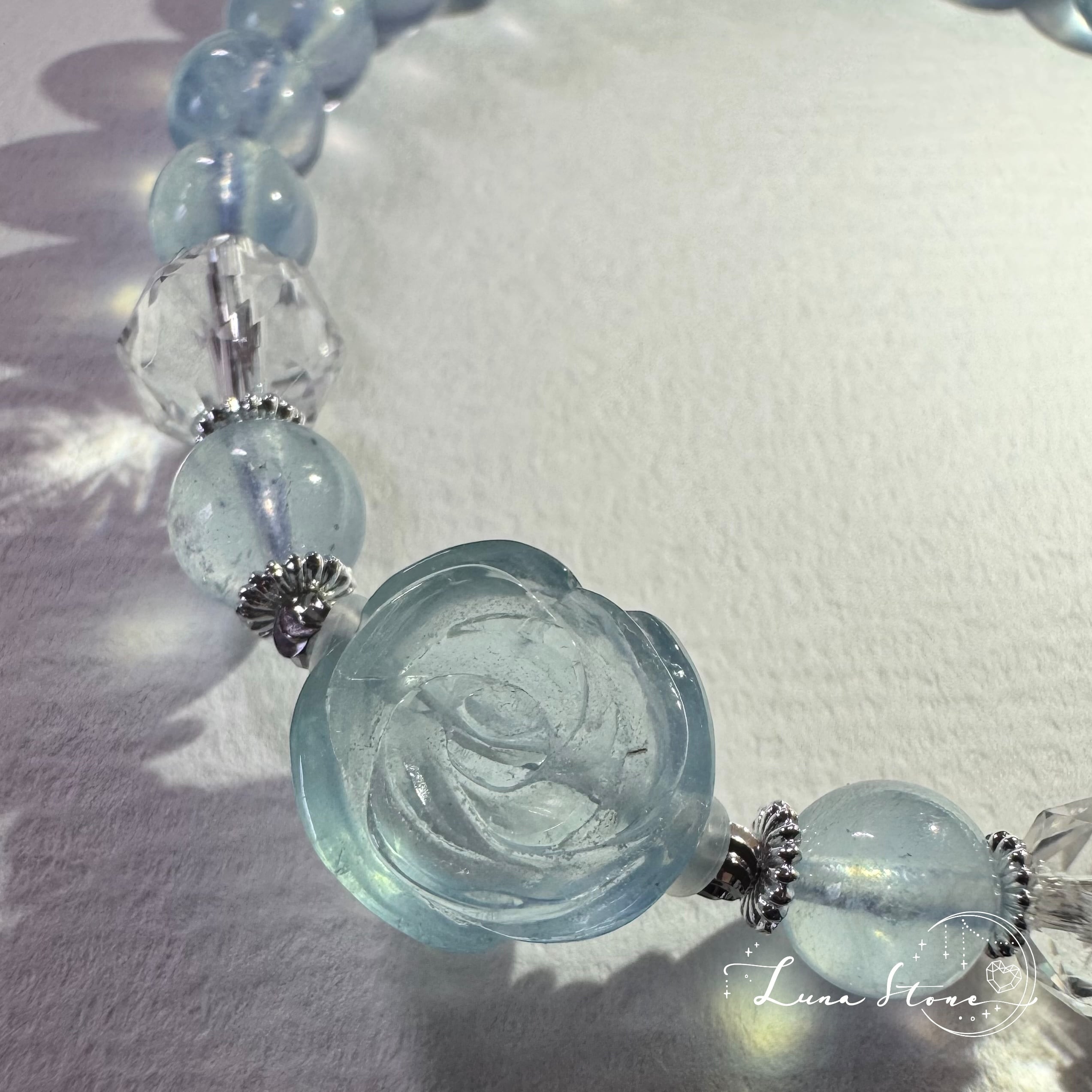 【アクアマリン×水晶】澄んだ光が広がる優美なローズデザイン 天然石 ブレスレット