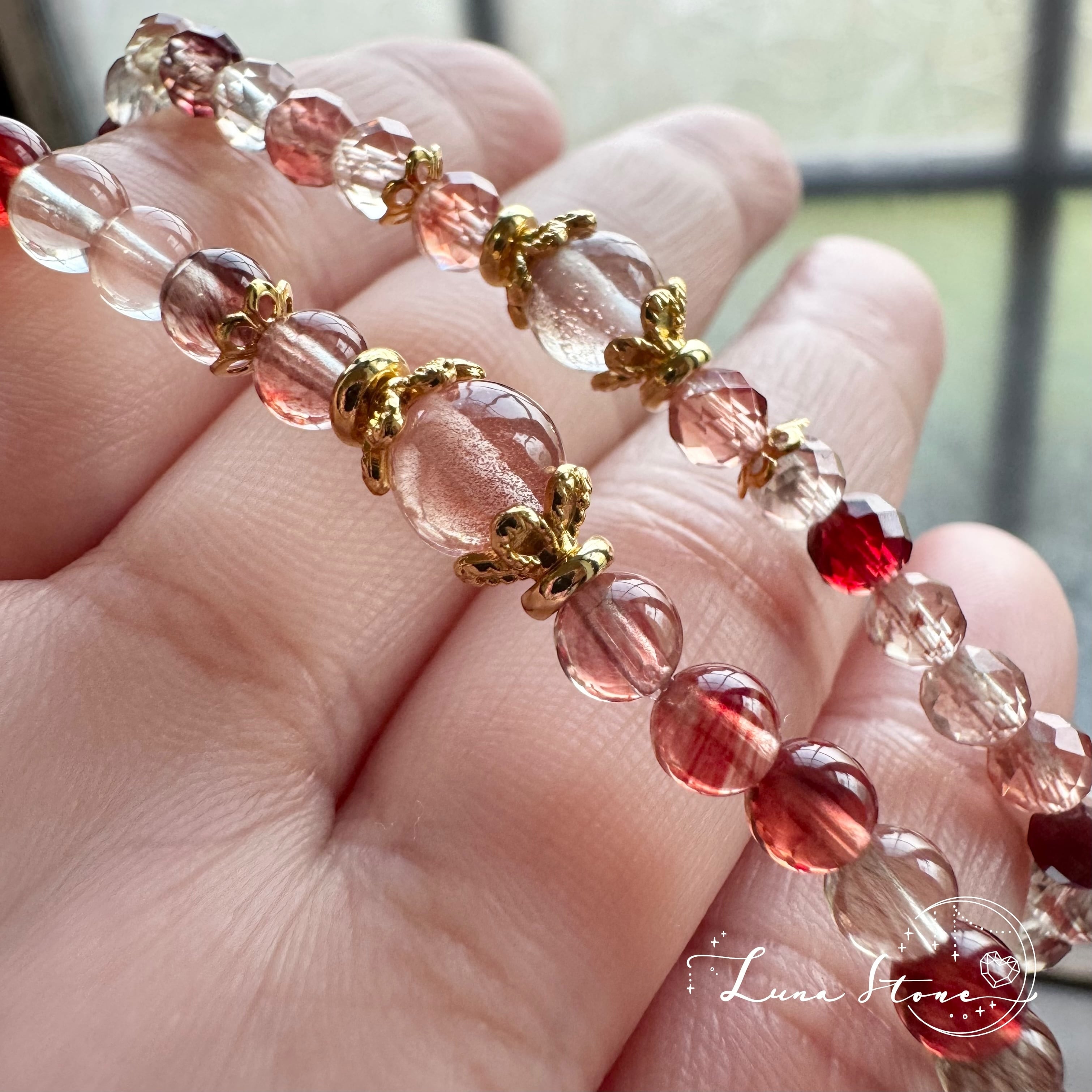 アンデシンは同じく長石グループに属する石で、淡いピンクから赤系の色味と高い透明感が特徴です。