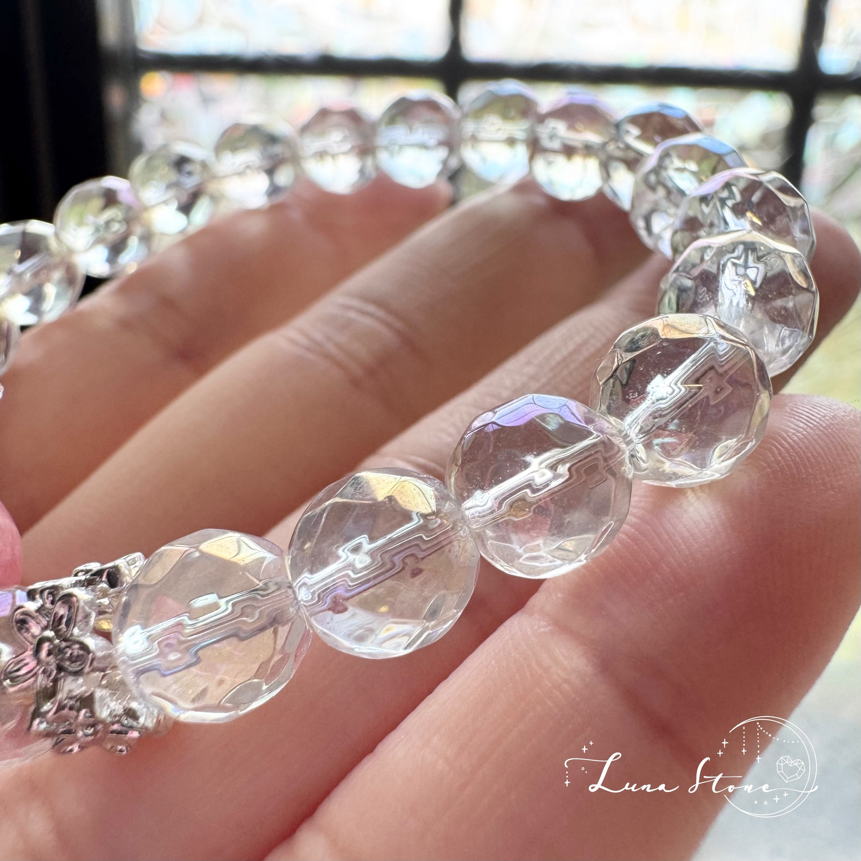 アクアオーラは、水晶の表面に特殊加工を施すことで生まれるクリアで軽やかな輝きが特徴で、角度によって淡い虹色の反射を楽しめます。