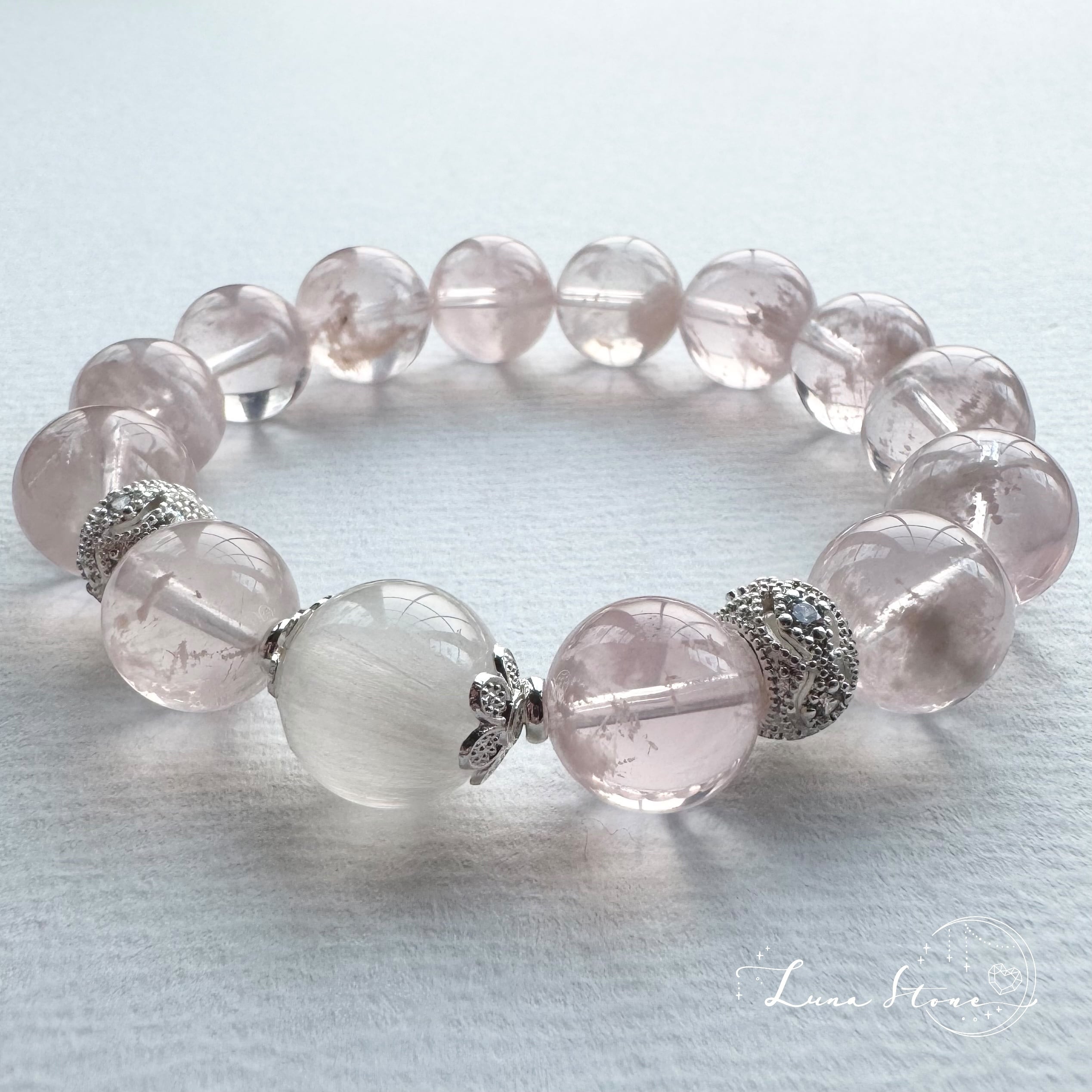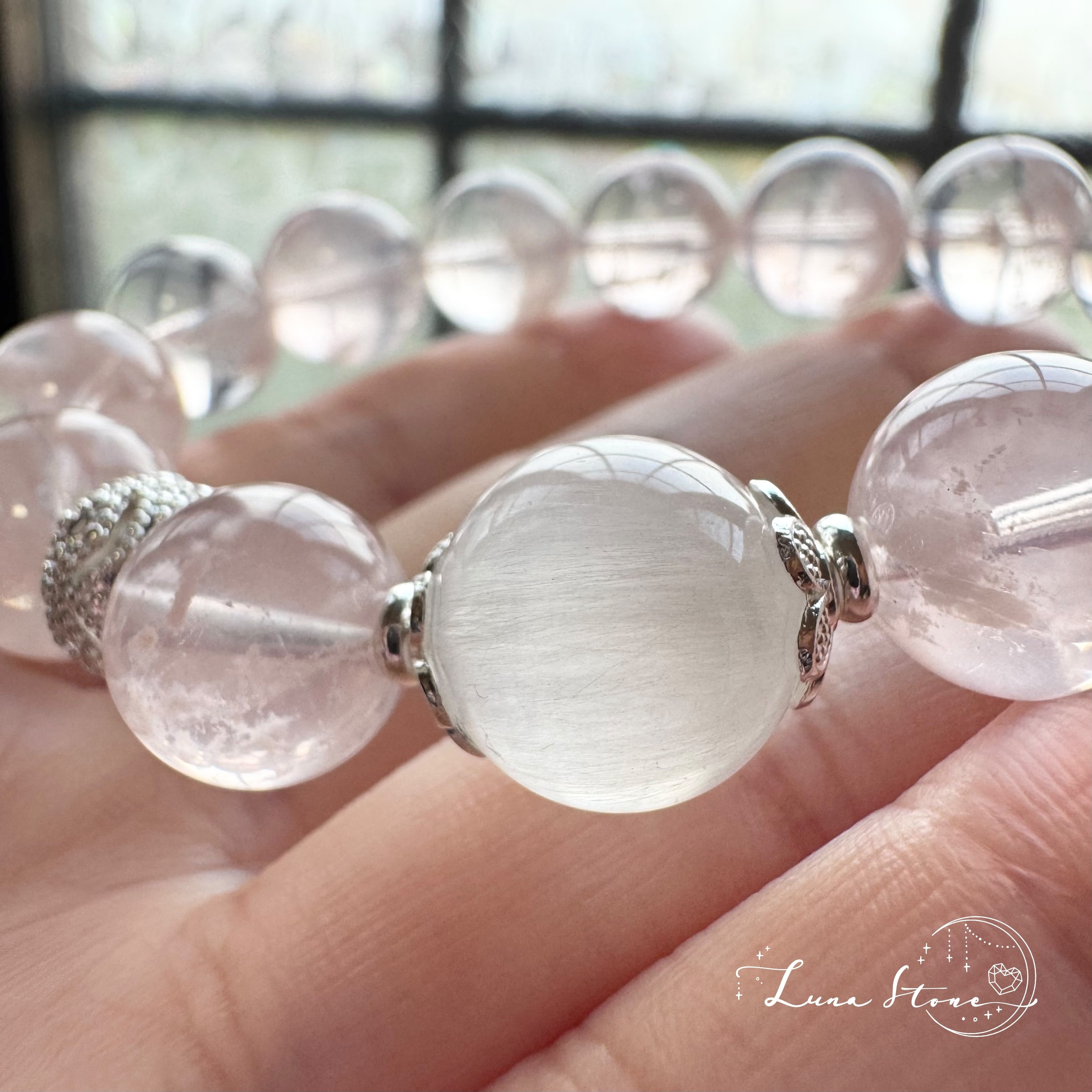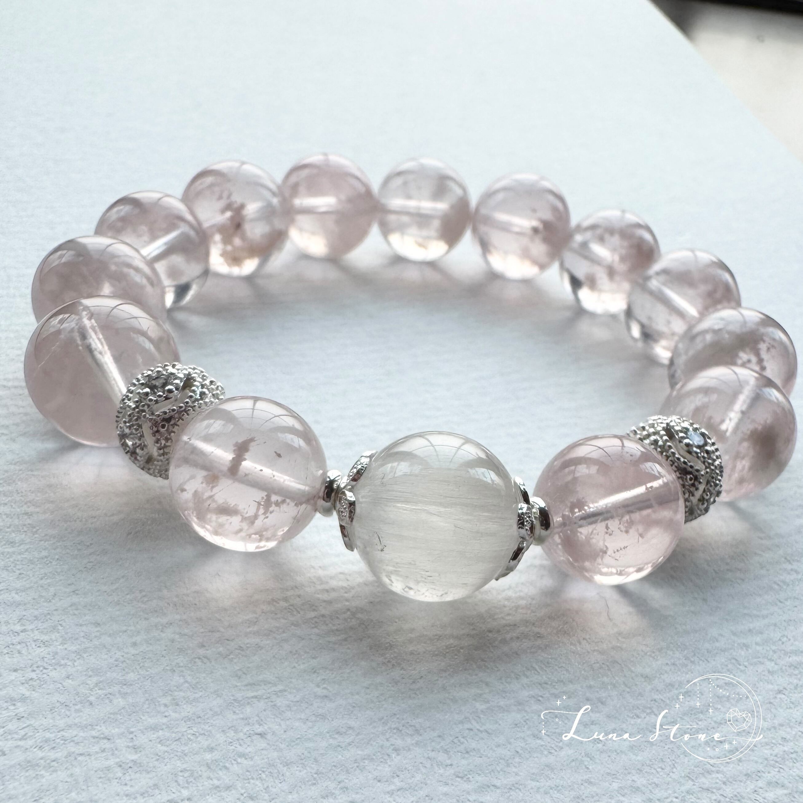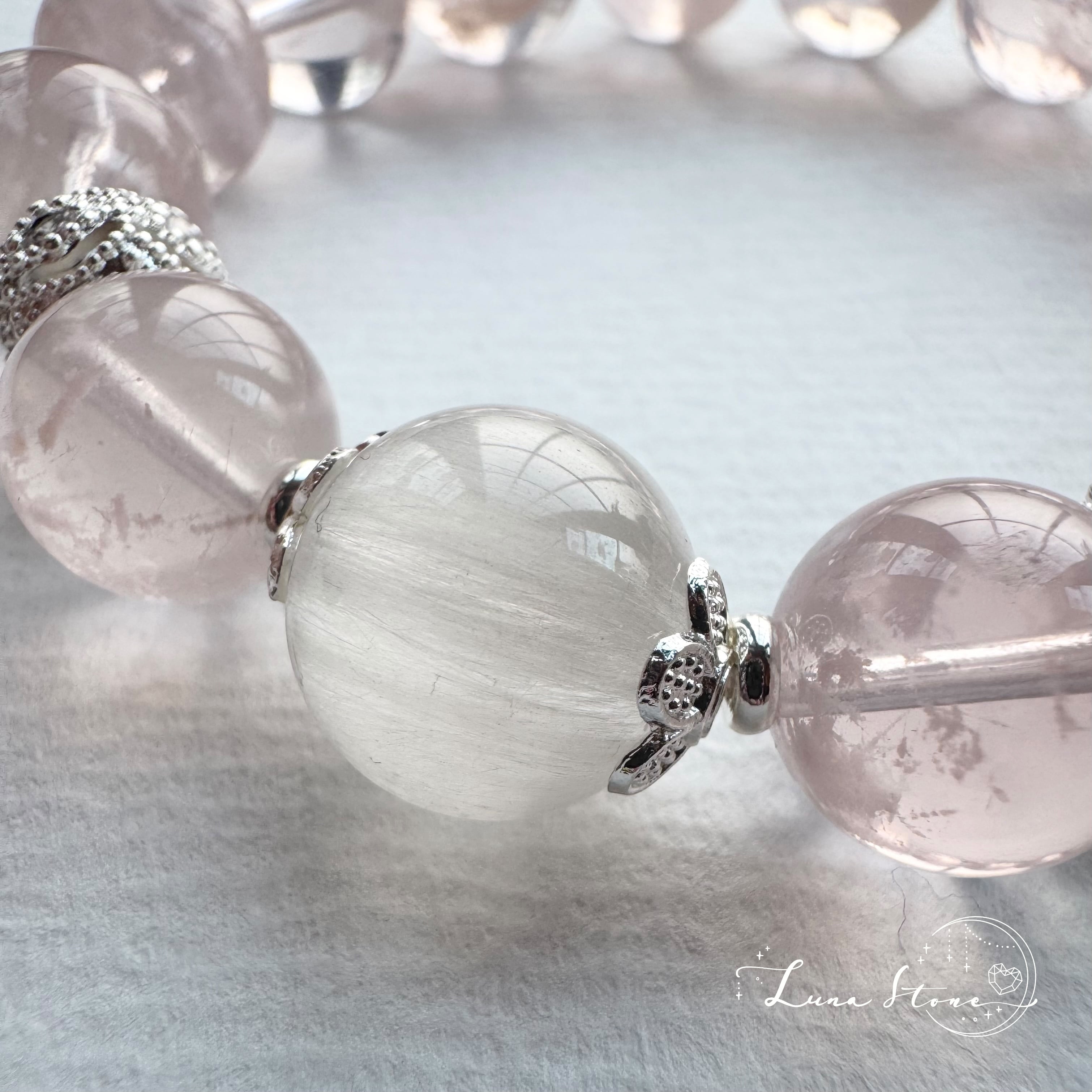白く静かな印象のホワイトサゲと、淡色ローズのセリサイトインローズクォーツが組み合わさることで、全体はやさしく落ち着いたトーンにまとまり、内包の表情をじっくり楽しめるブレスレットに仕上がっています。