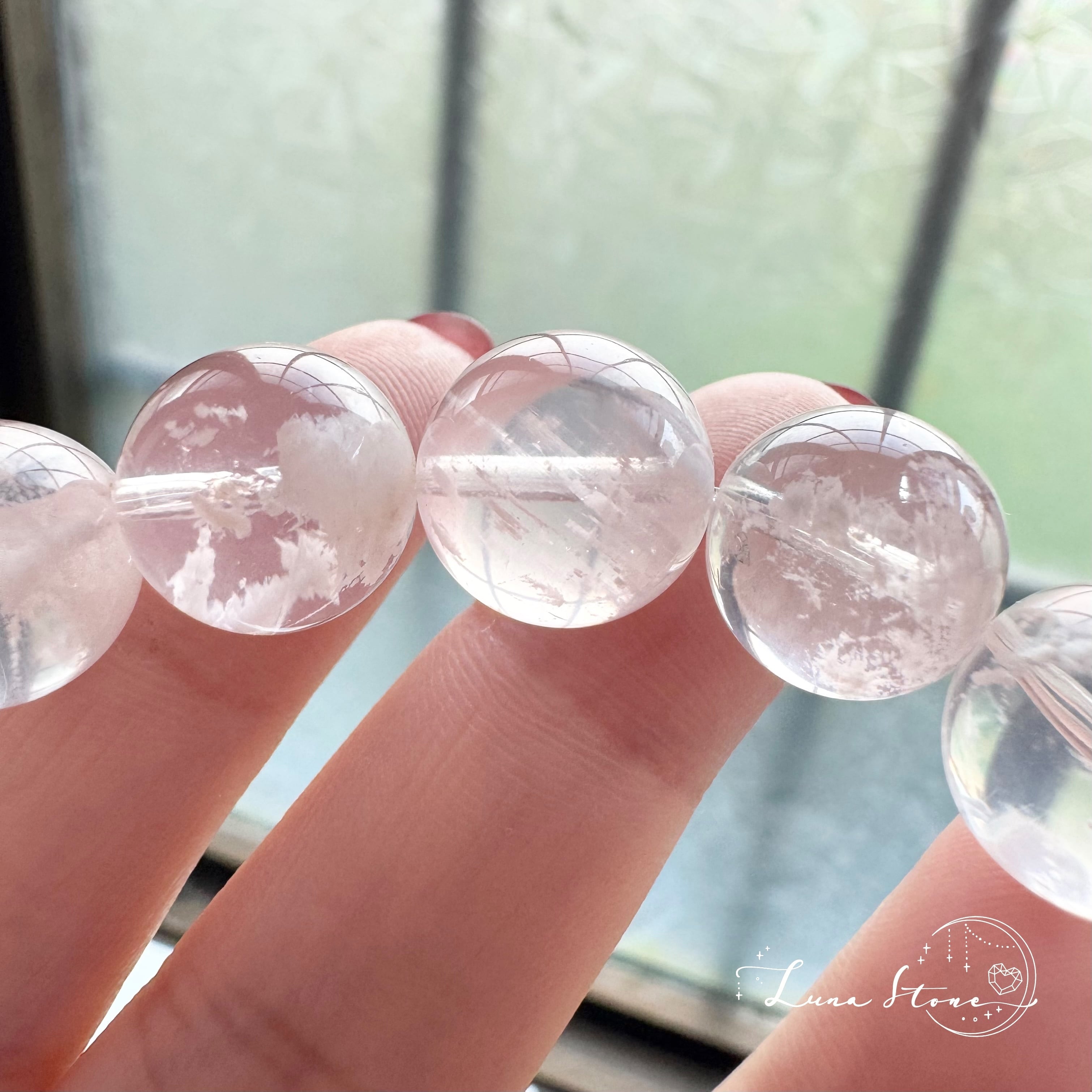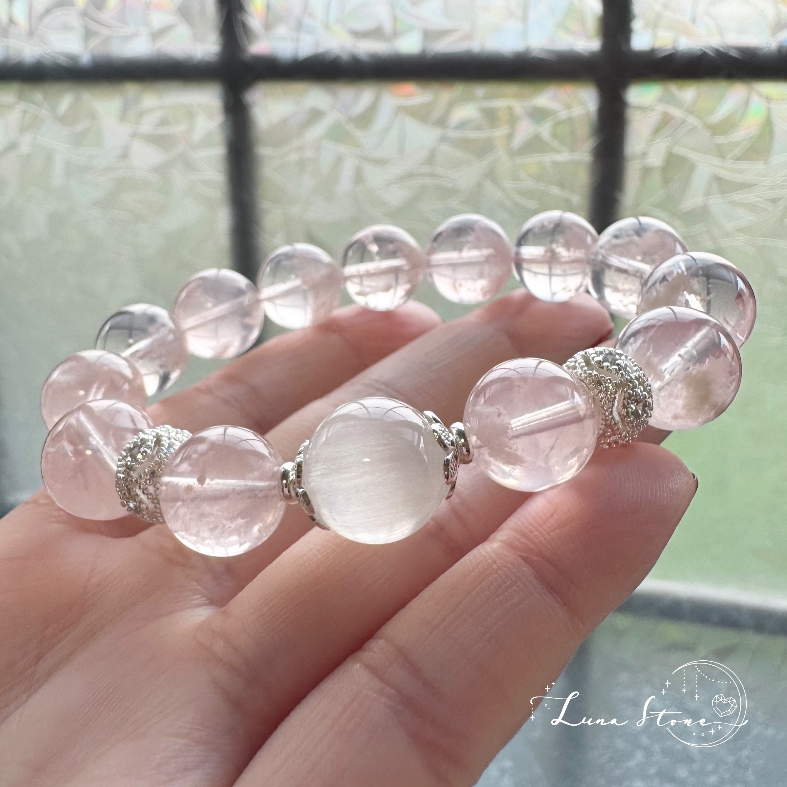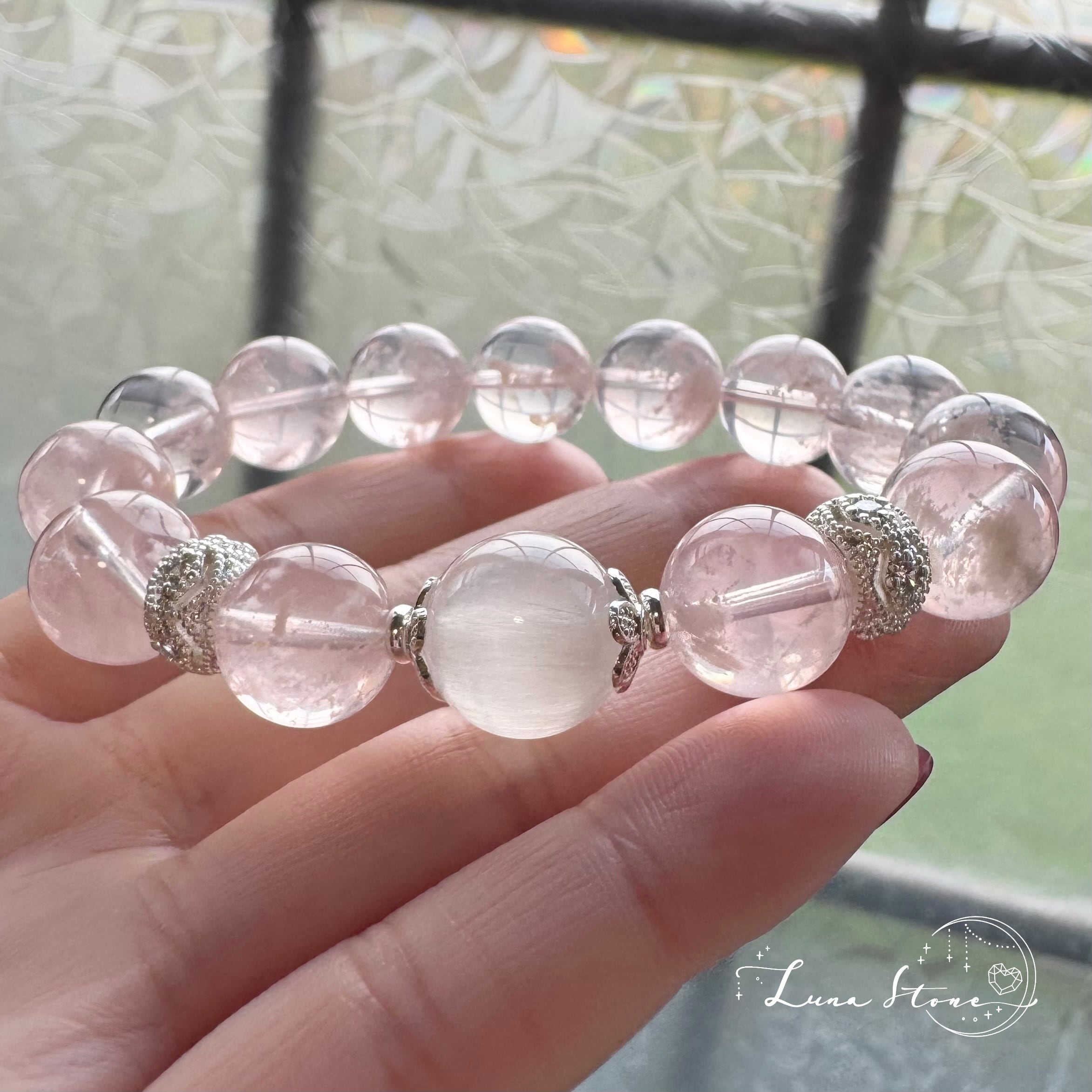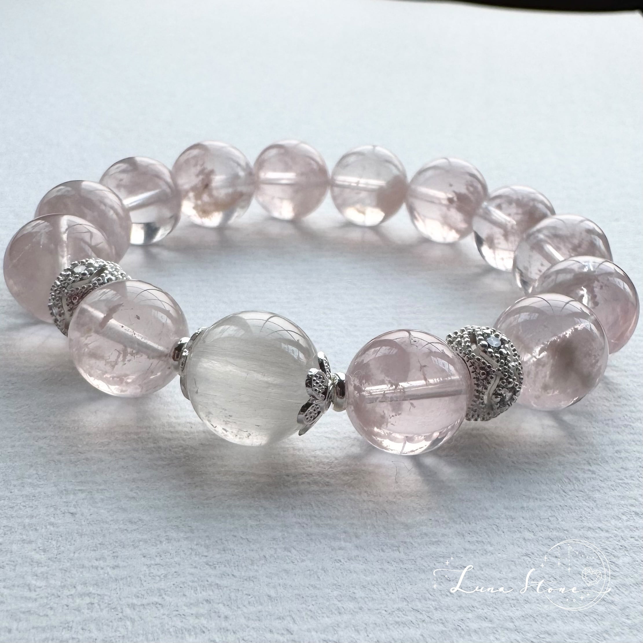 白く静かな印象のホワイトサゲと、淡色ローズのセリサイトインローズクォーツが組み合わさることで、全体はやさしく落ち着いたトーンにまとまり、内包の表情をじっくり楽しめるブレスレットに仕上がっています。