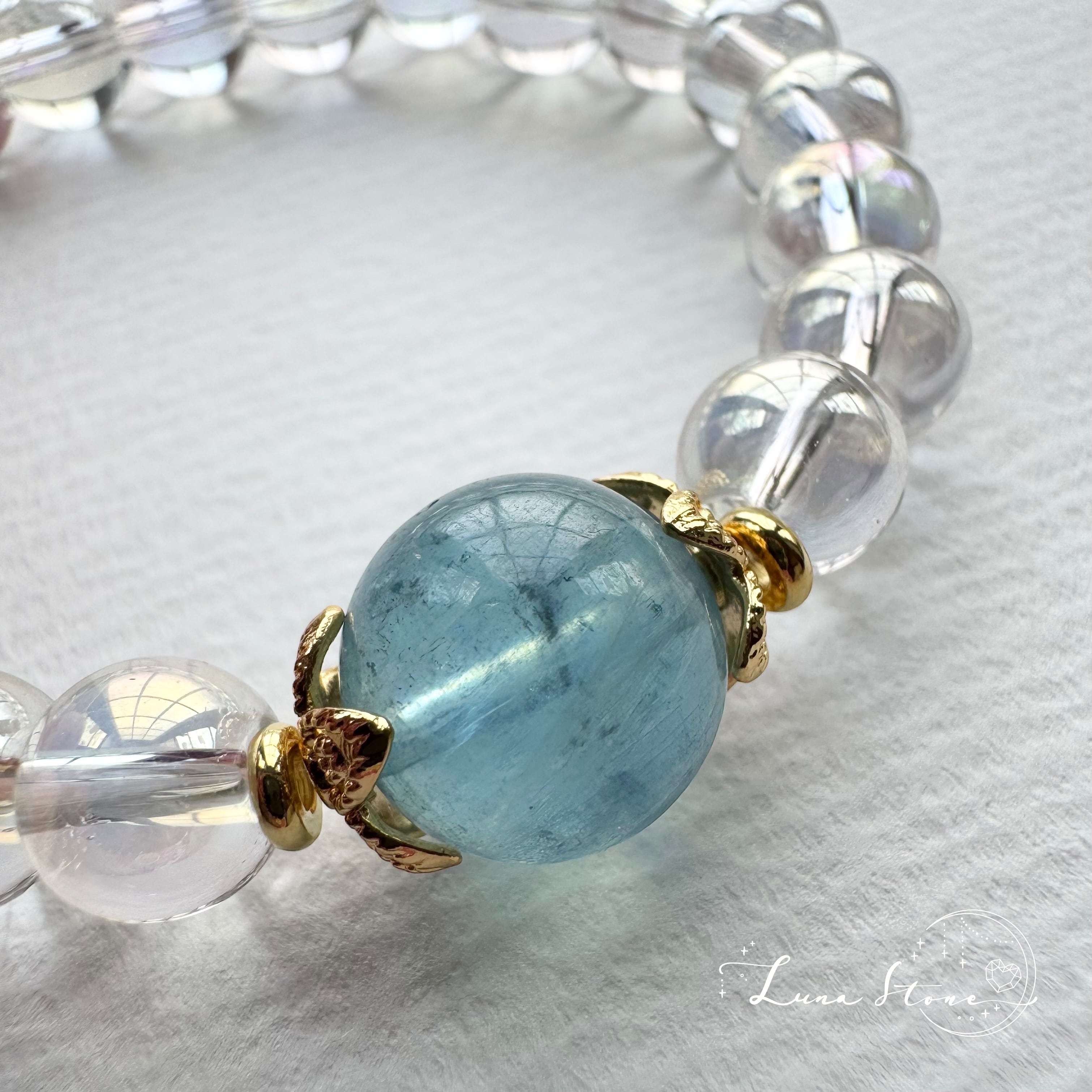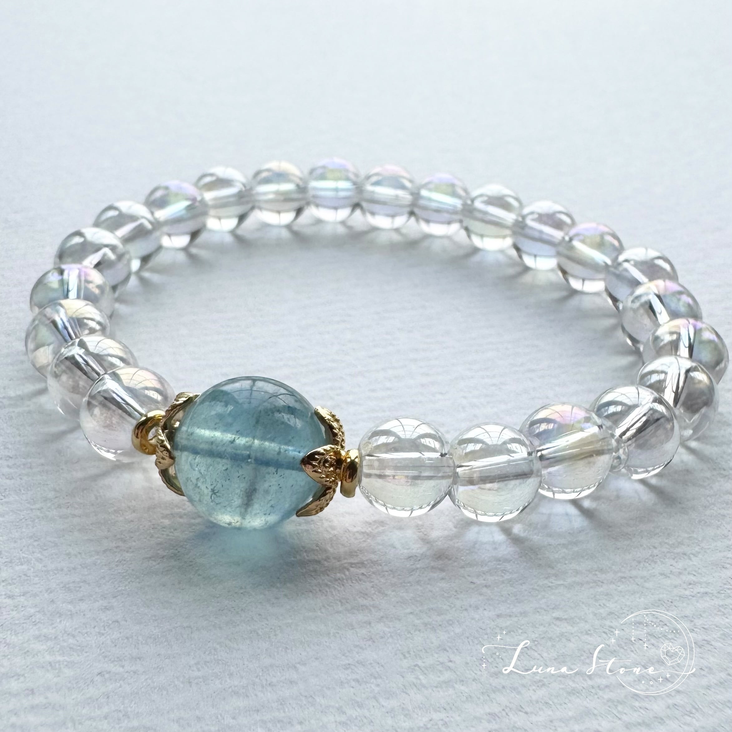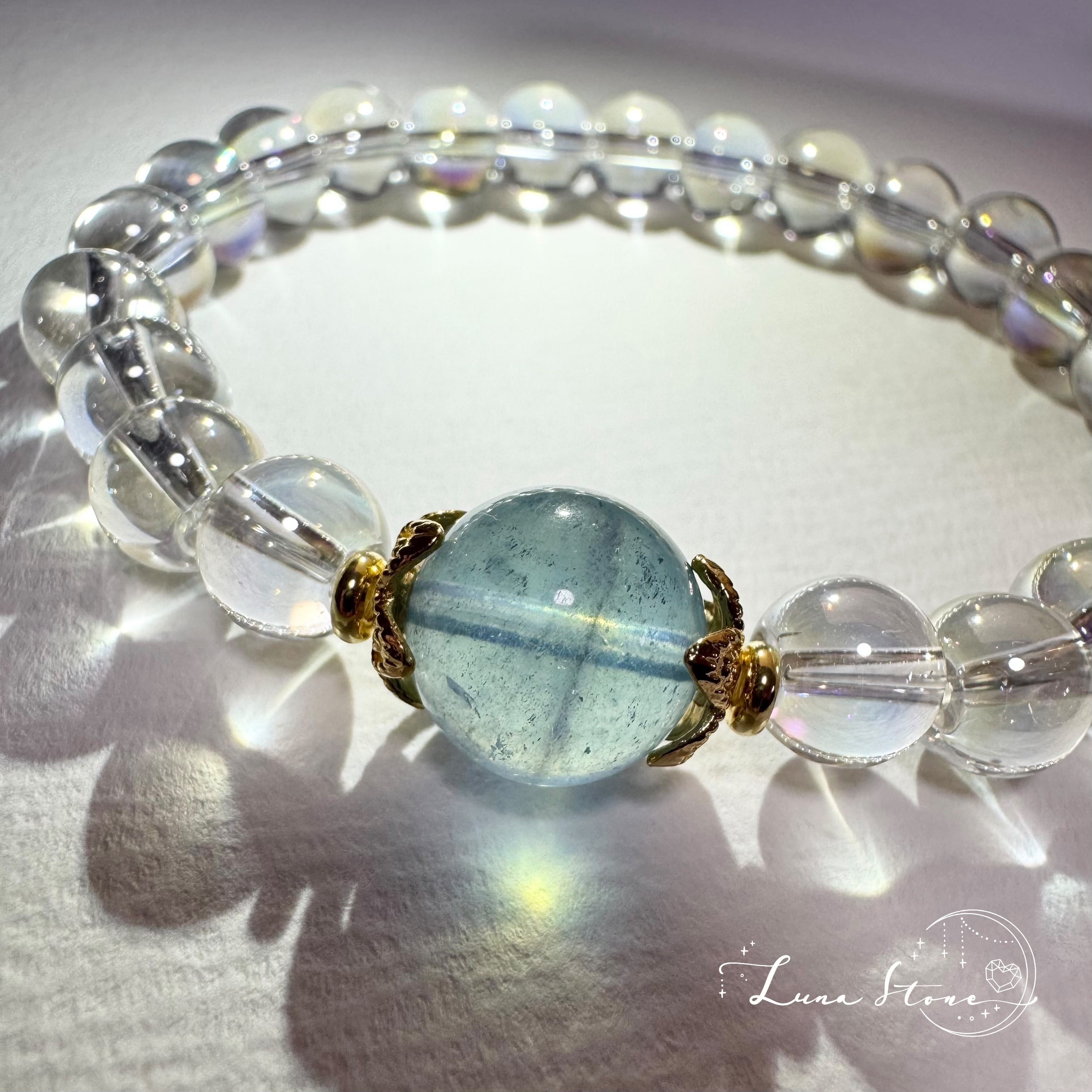澄んだ透明感の中に、穏やかな青とやさしい光彩が重なり合う、静けさと清らかさを感じさせる組み合わせのブレスレットです。