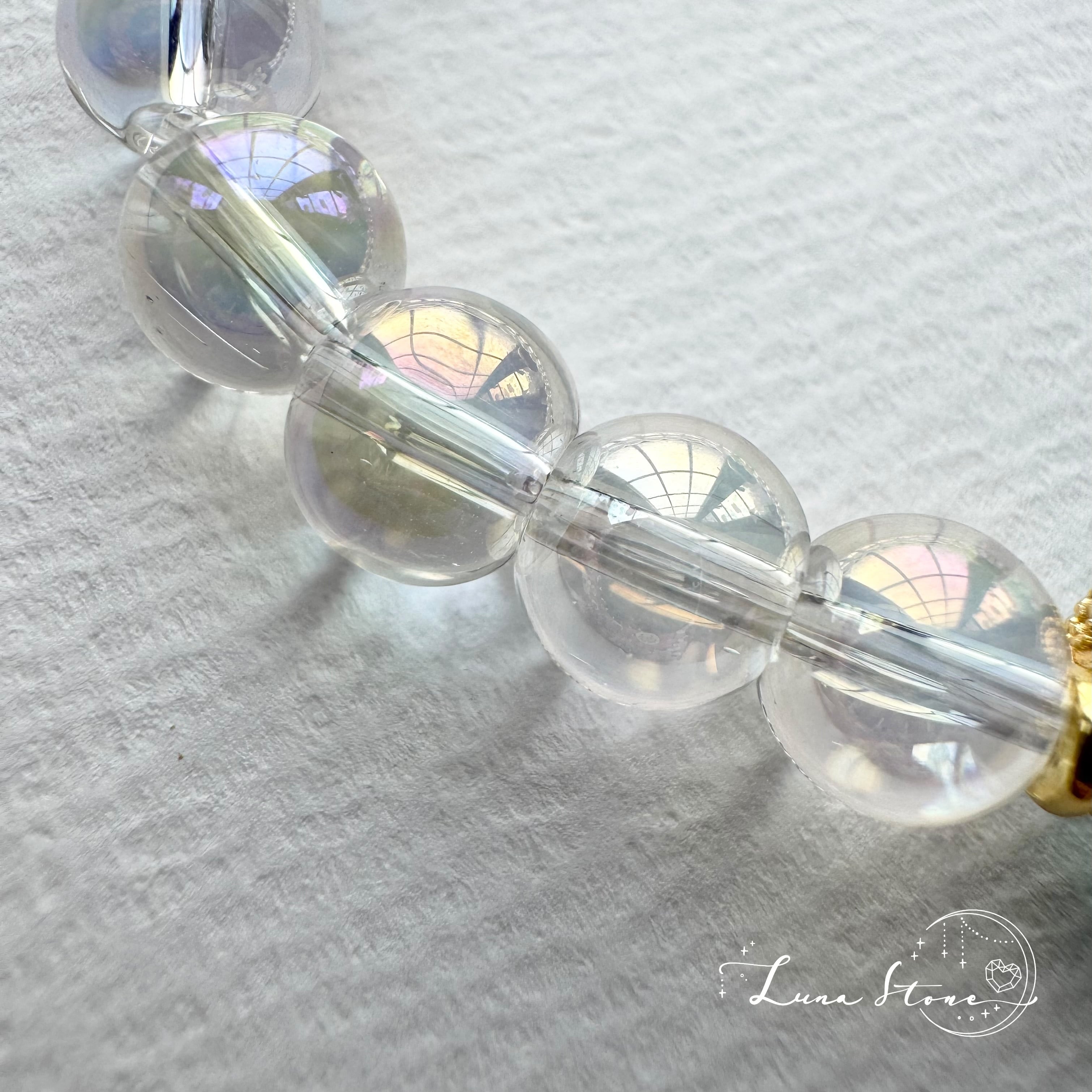 周囲にはアクアオーラを配置し、無色透明の水晶にオーロラ加工特有の淡い虹色の光沢が重なり、角度によってピンクやブルーの光がやさしく反射します。