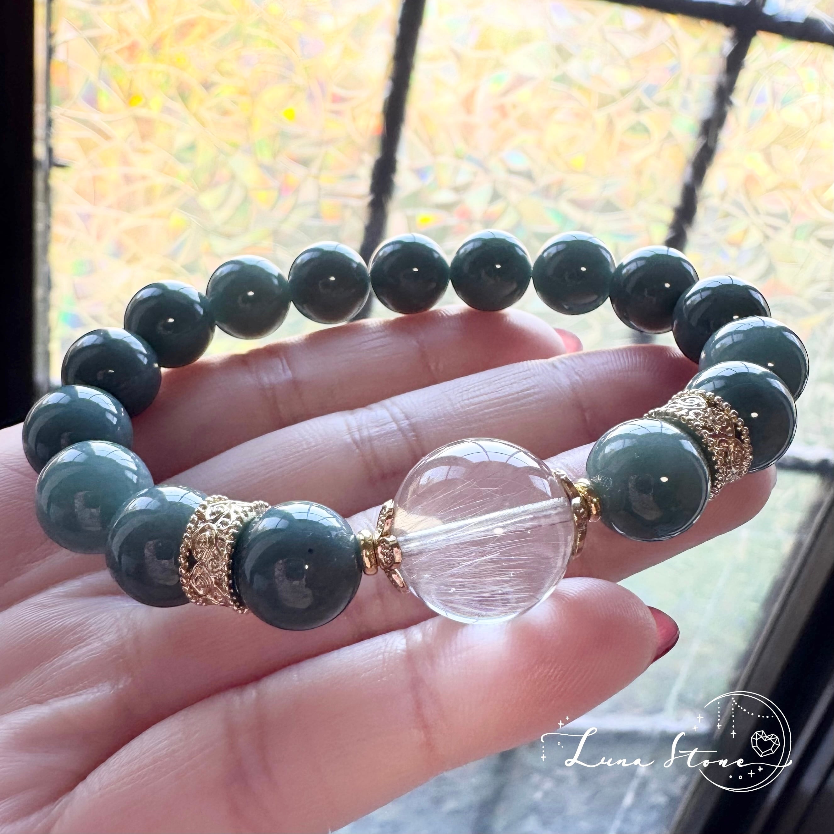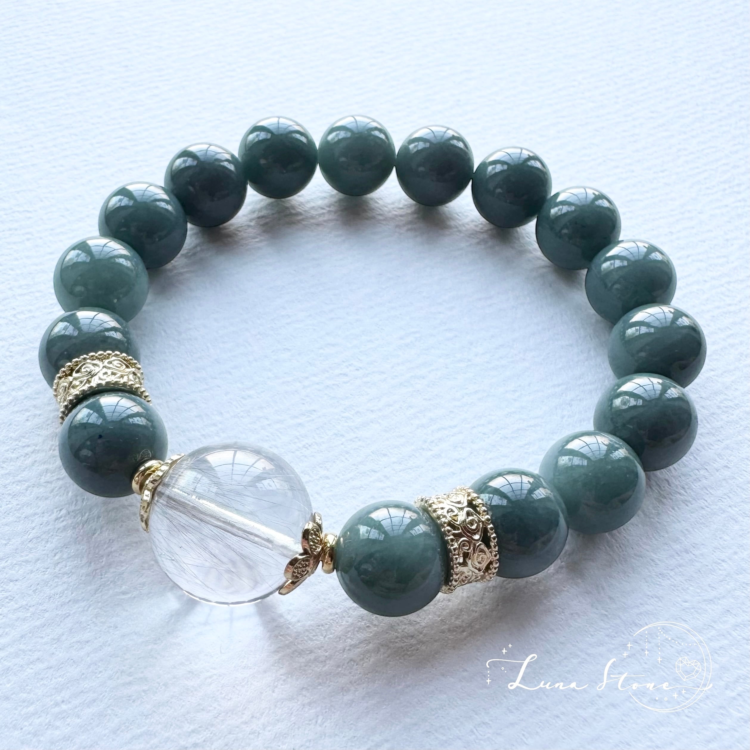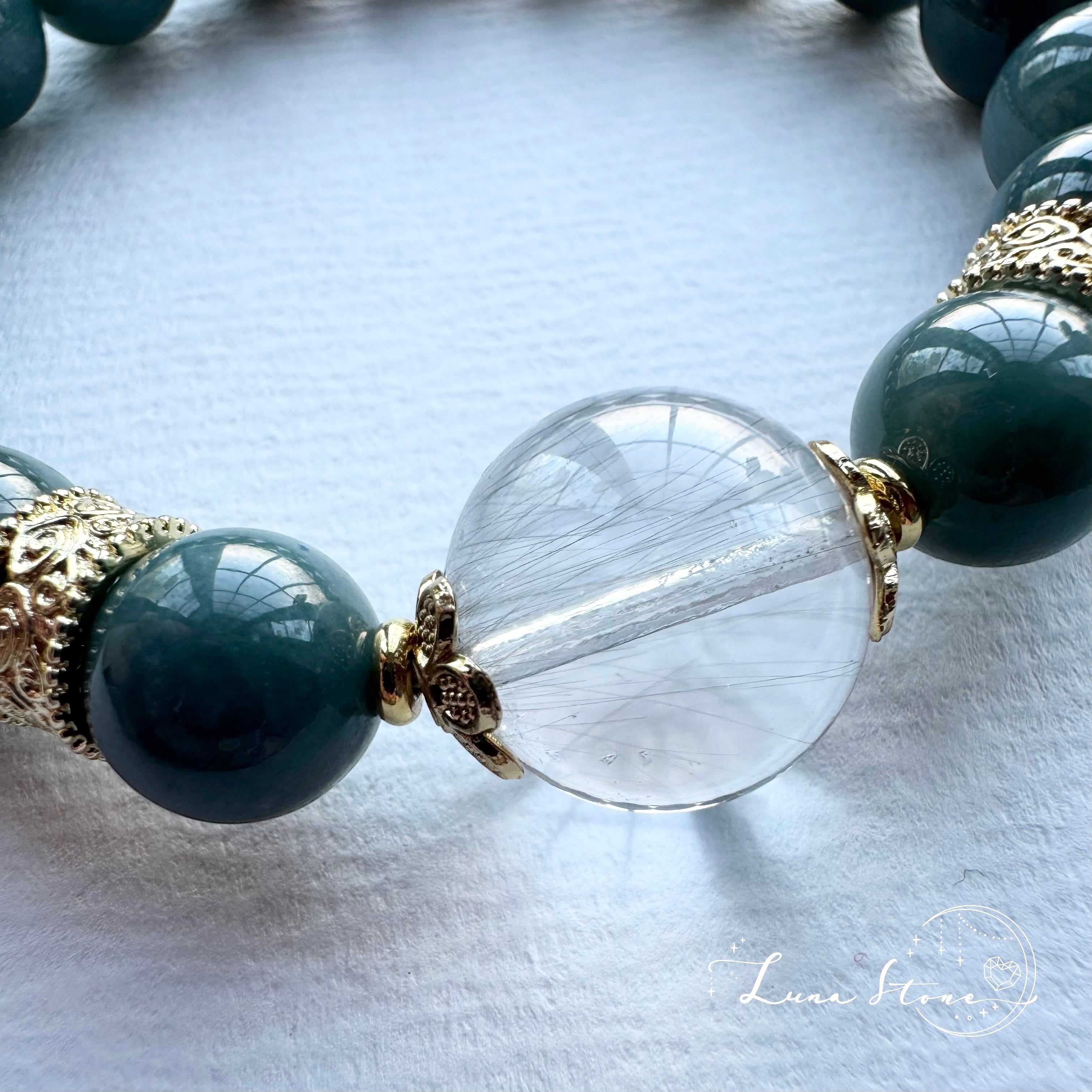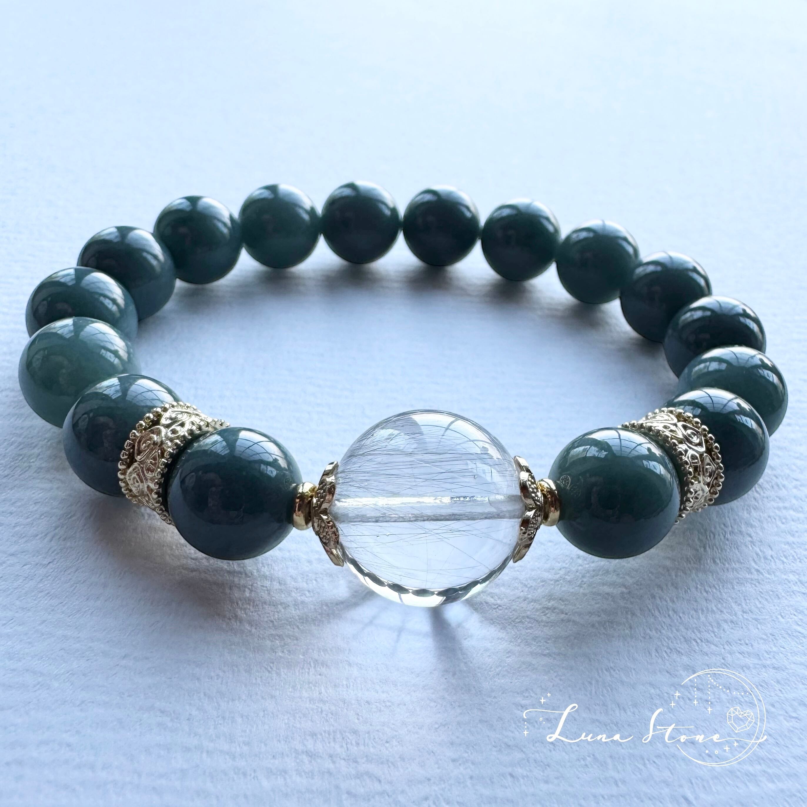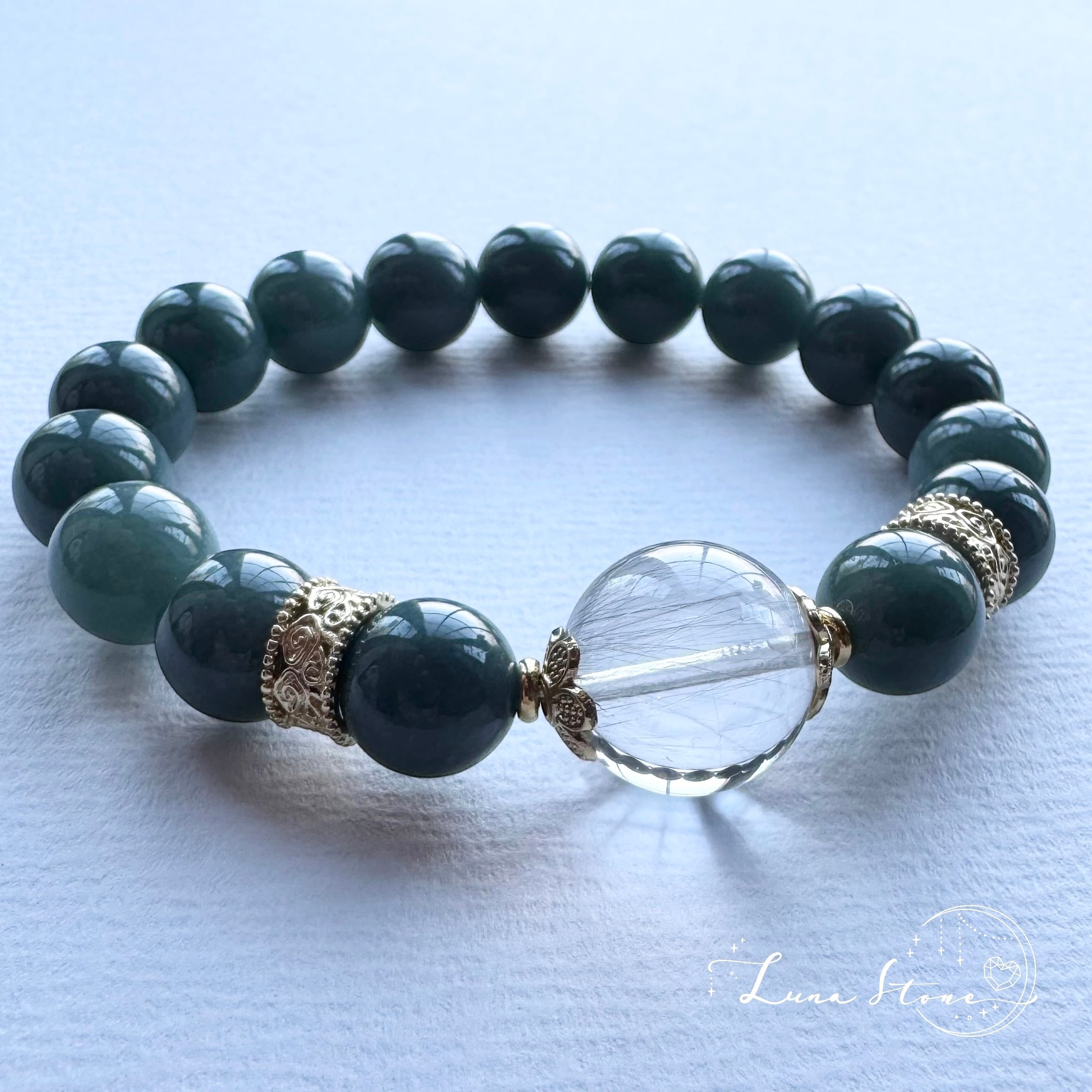 【プラチナルチル × ブルー翡翠】透明感と深緑のコントラスト 天然石 ブレスレット