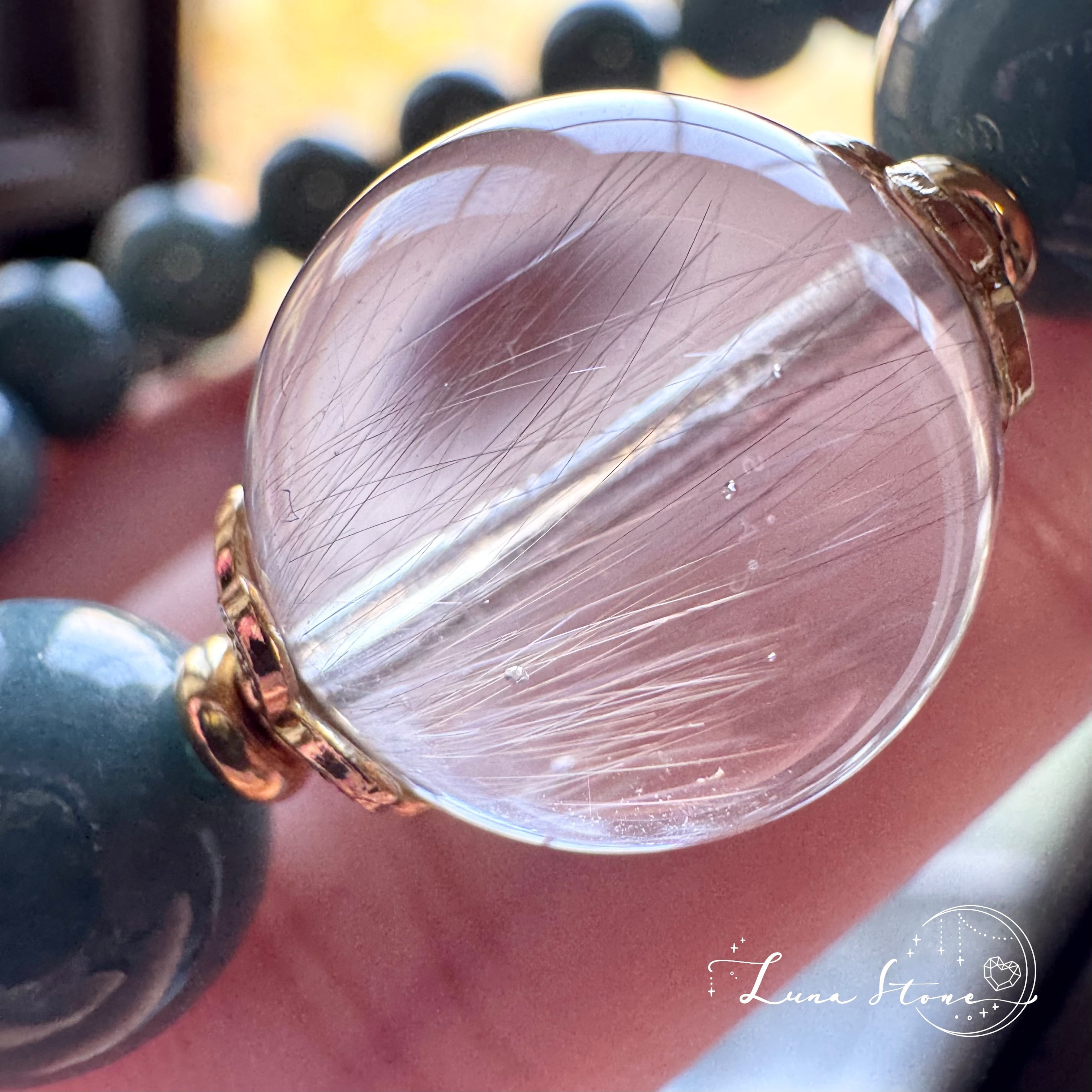 光を受けると、ルチルが内側から淡く浮かび上がり、上品で静かな輝きを放つ粒です。