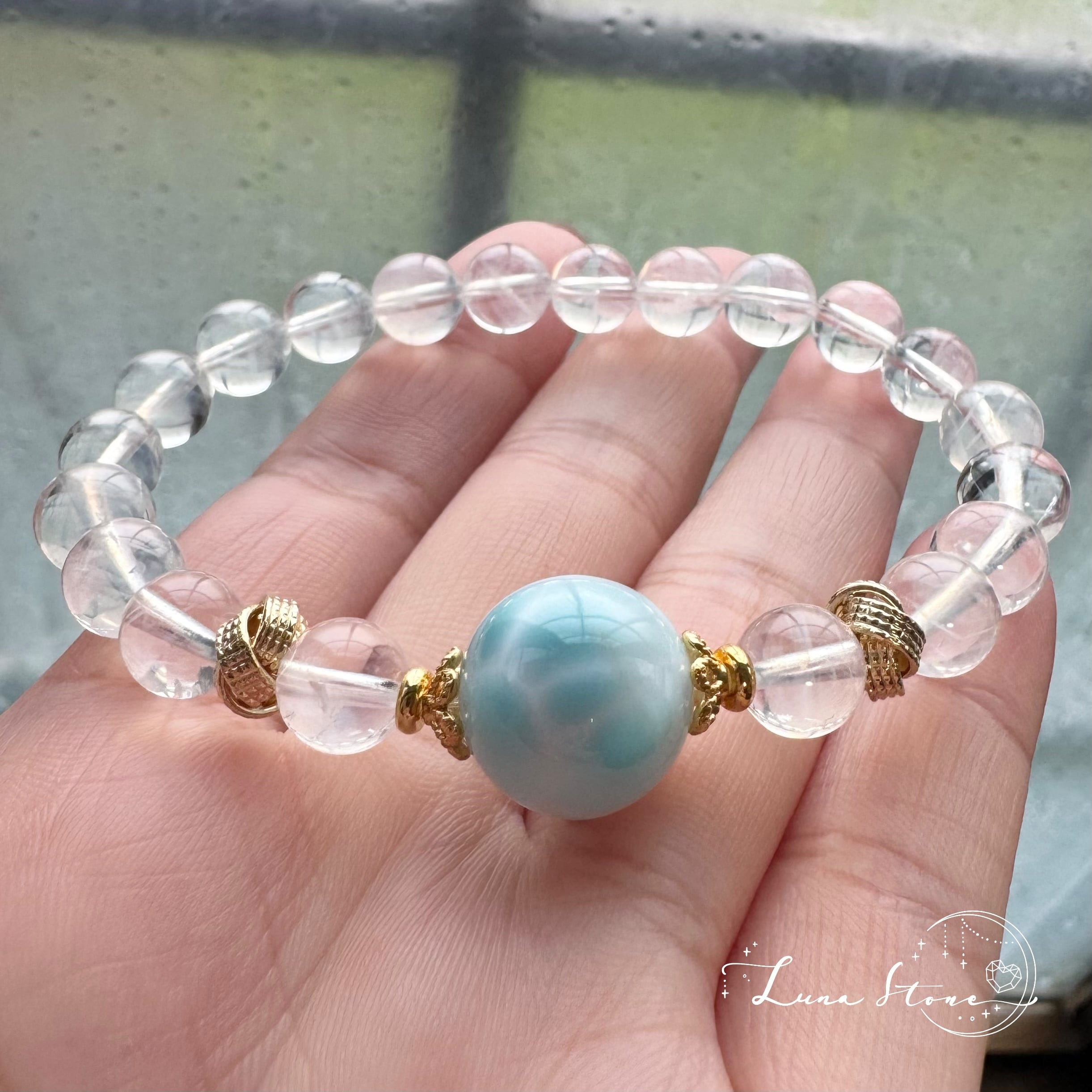 透明な水晶の中に、角度によって階段状の光の反射が現れ、ラリマーのやわらかな色彩を引き立てながら、全体に清らかさと軽やかさを添えています。