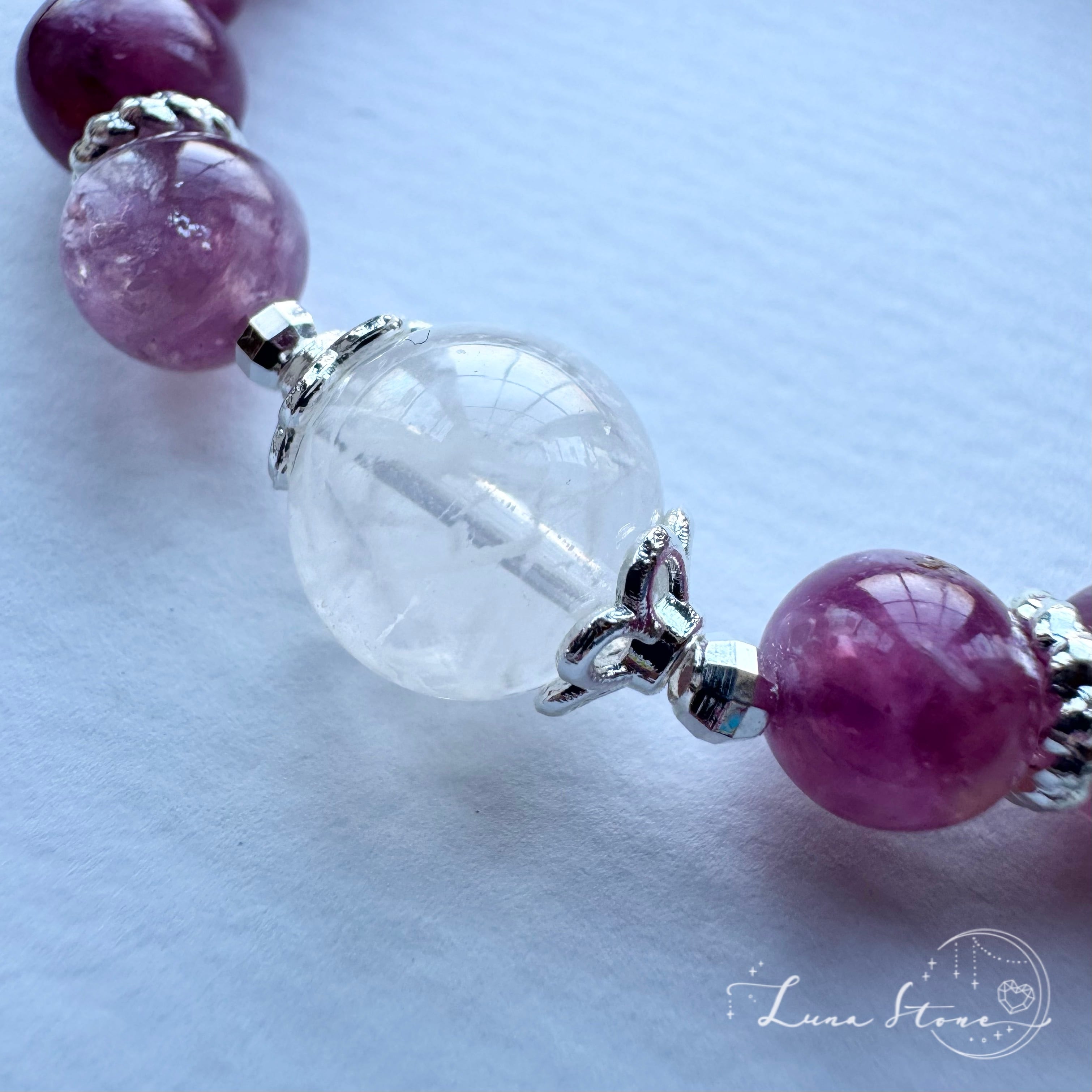 やわらかな光を内側にたたえたセリサイトインクォーツに、優しいピンクの色合いが美しいピンクマイカを組み合わせたブレスレットです。