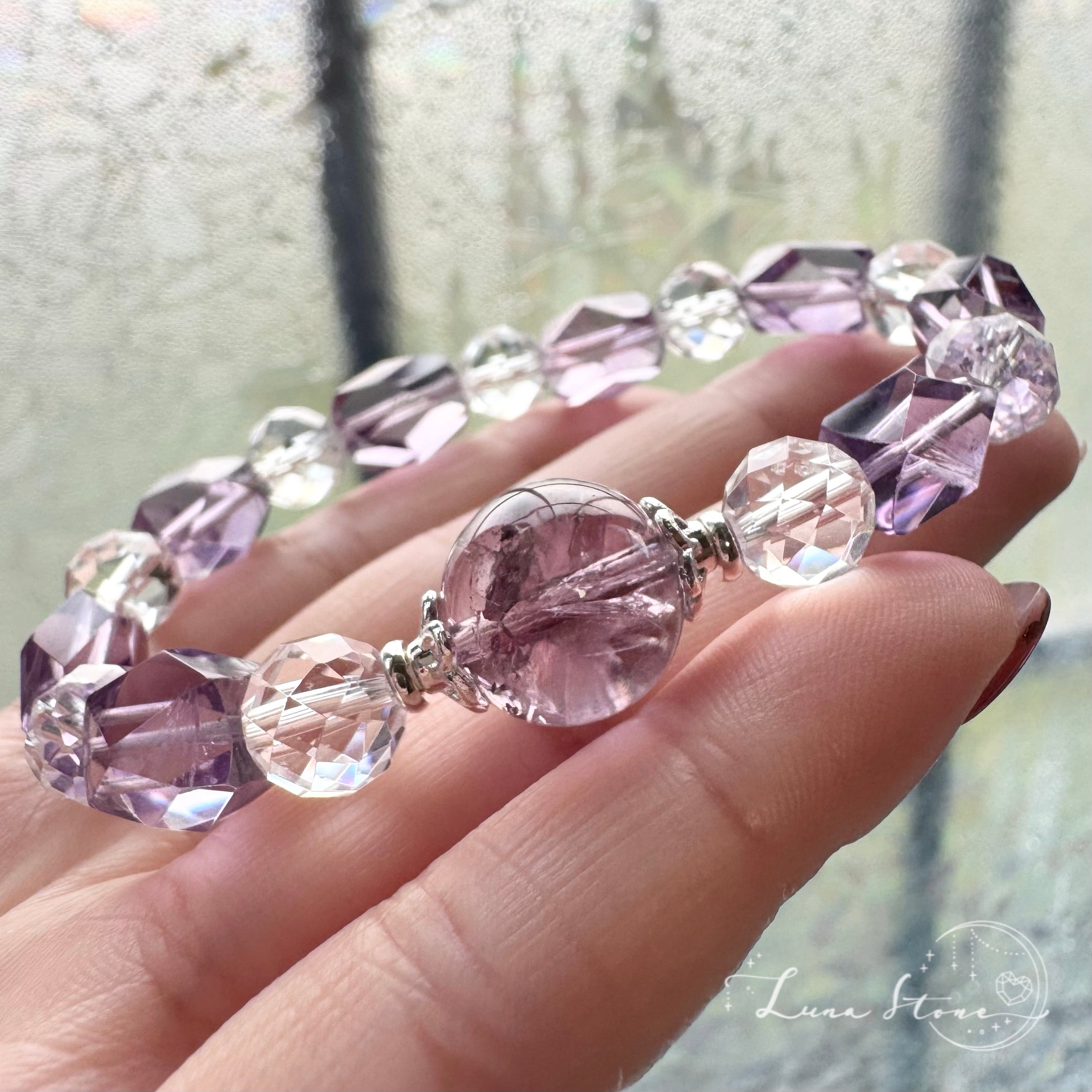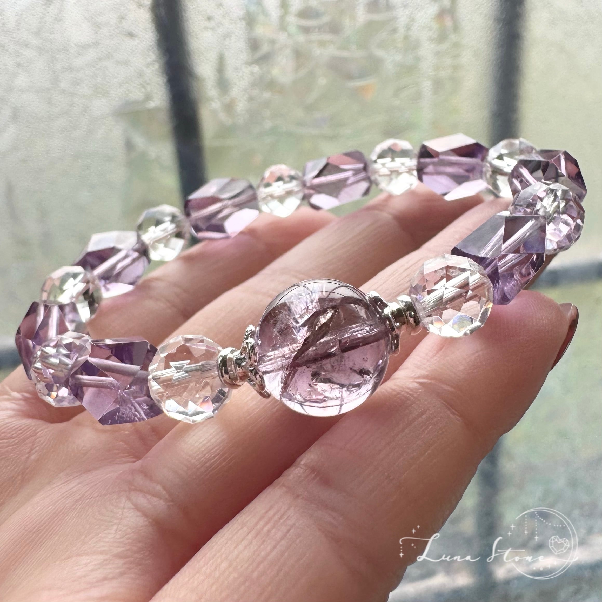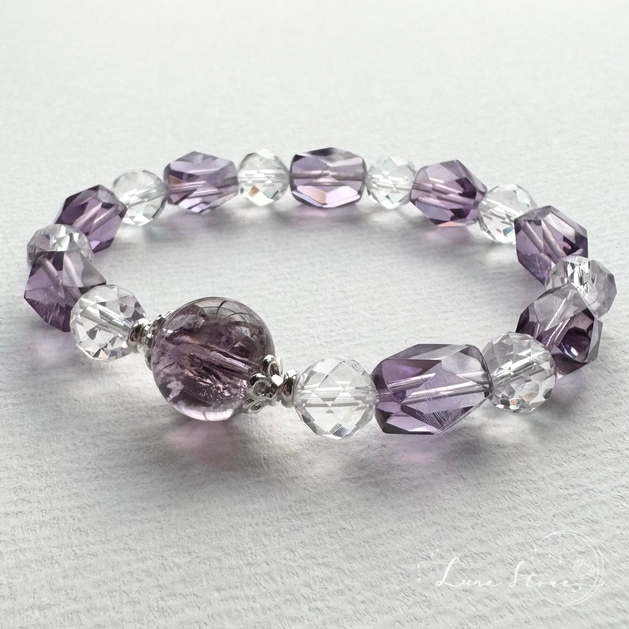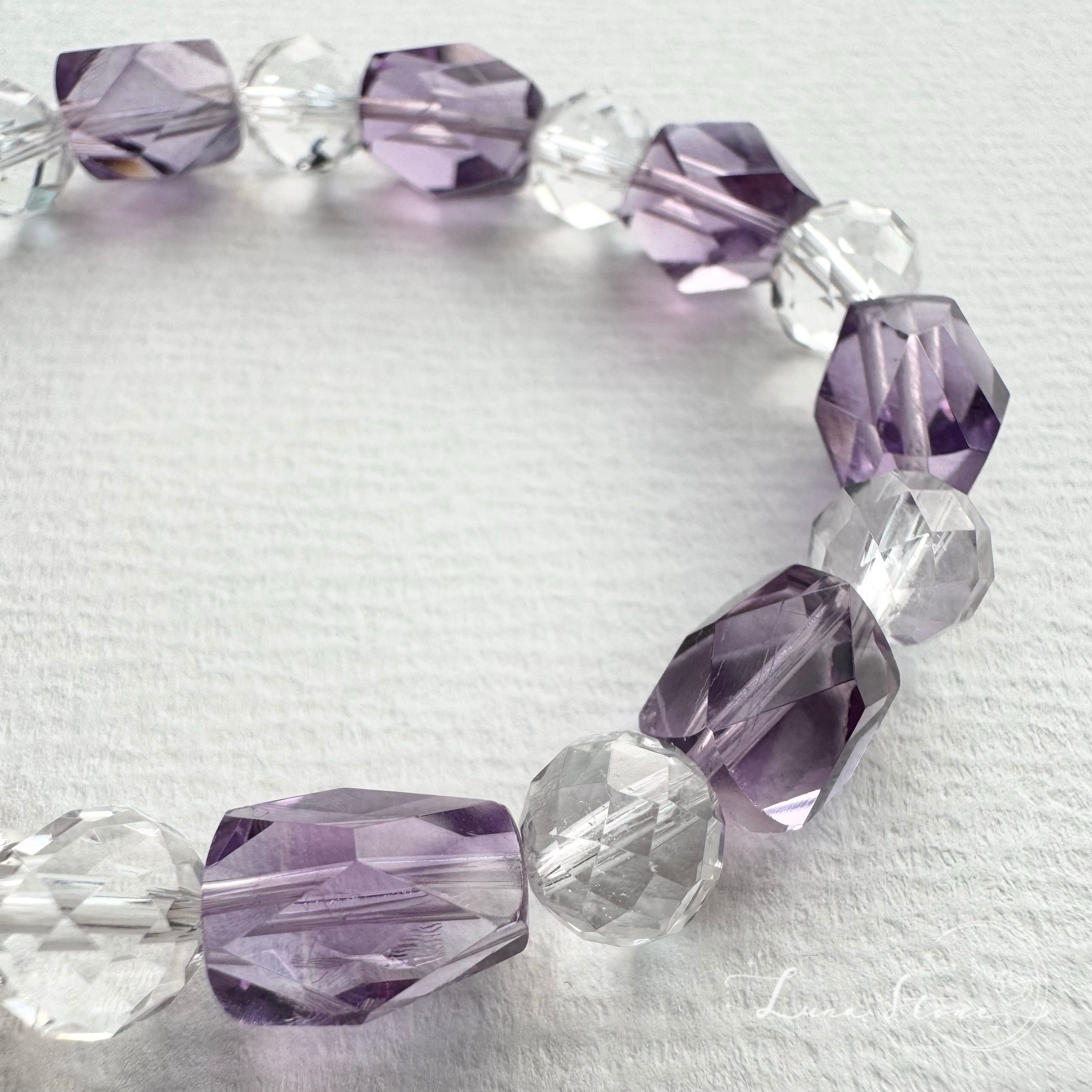 やわらかな紫の輝きを宿すアイリスアメジストをトップに、透明感あふれる水晶と、繊細なカットが美しいアメジストを組み合わせたブレスレットです。
