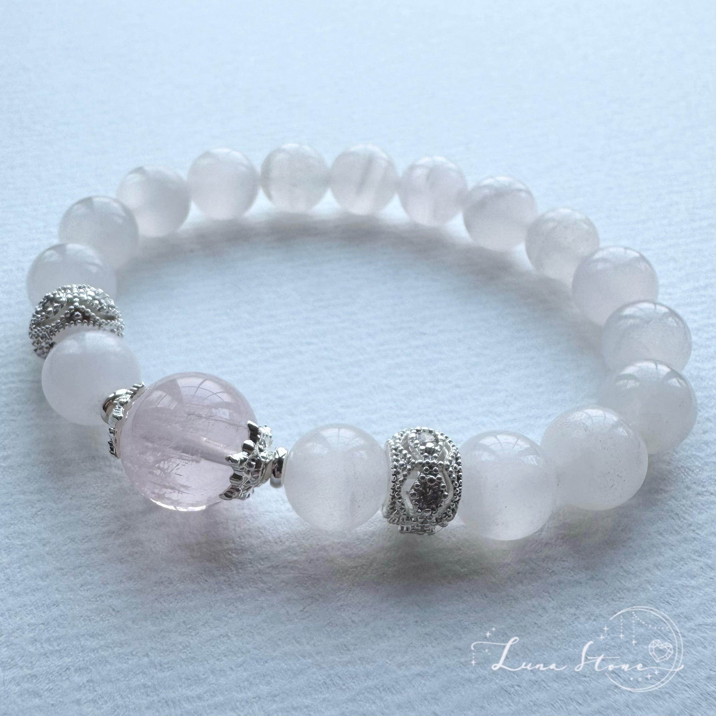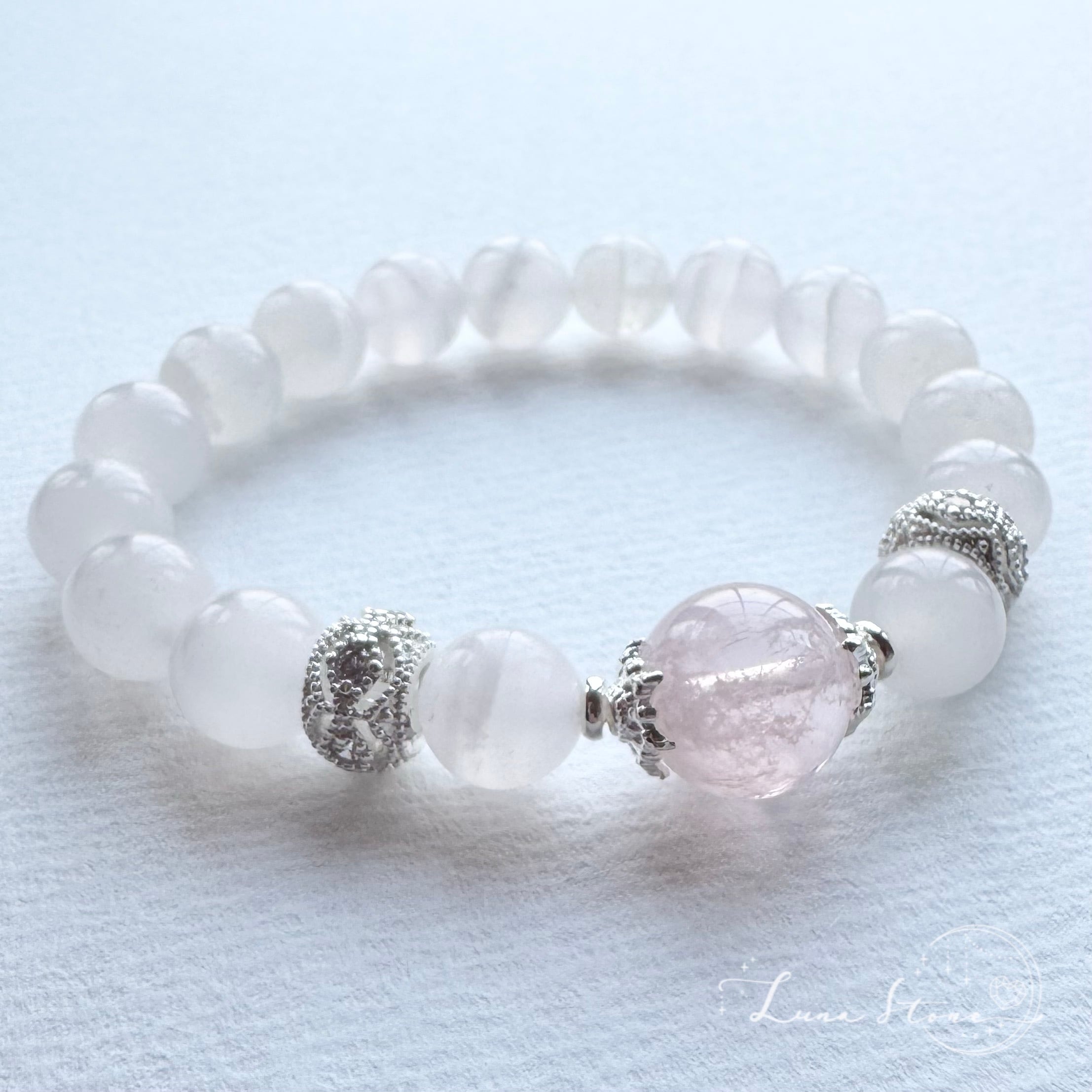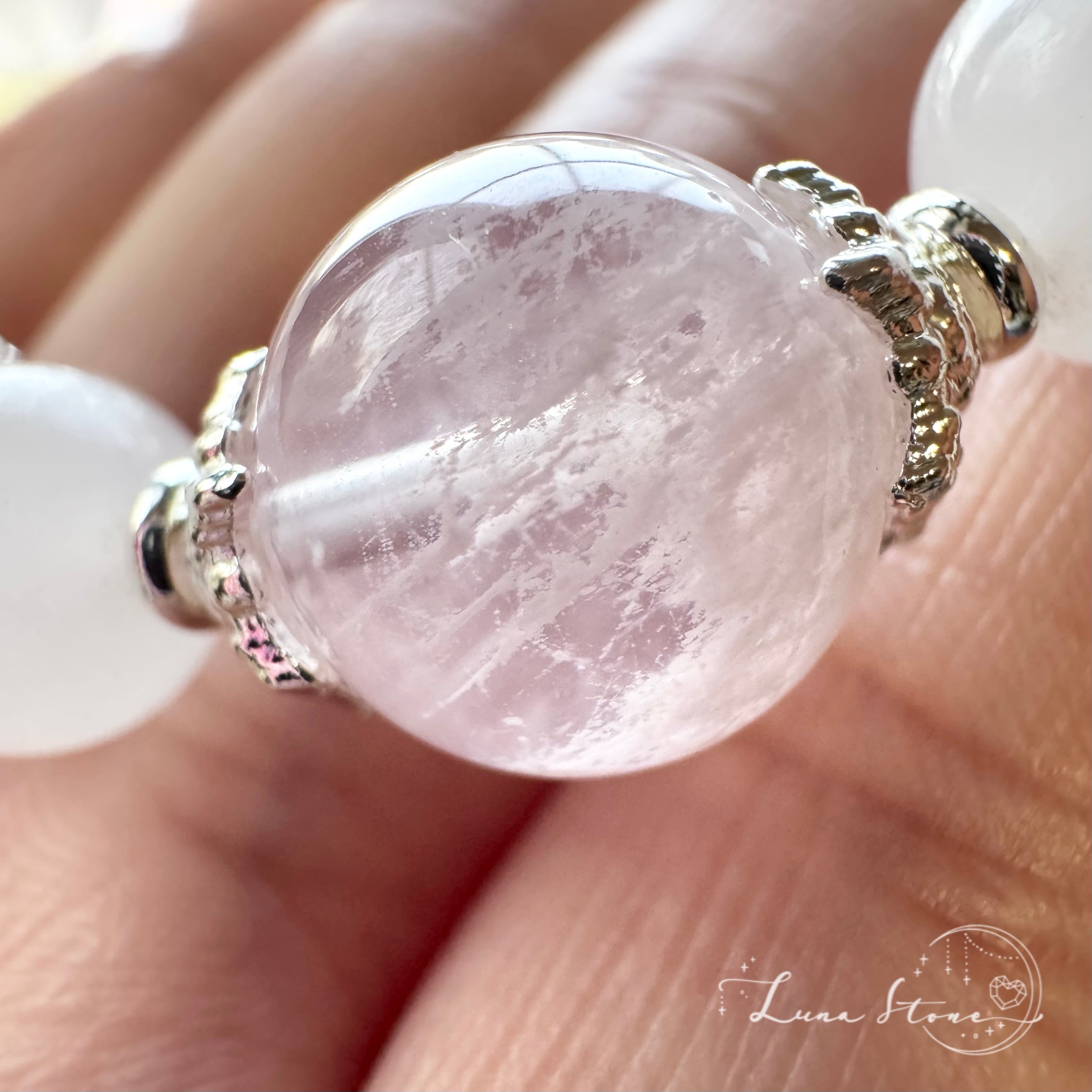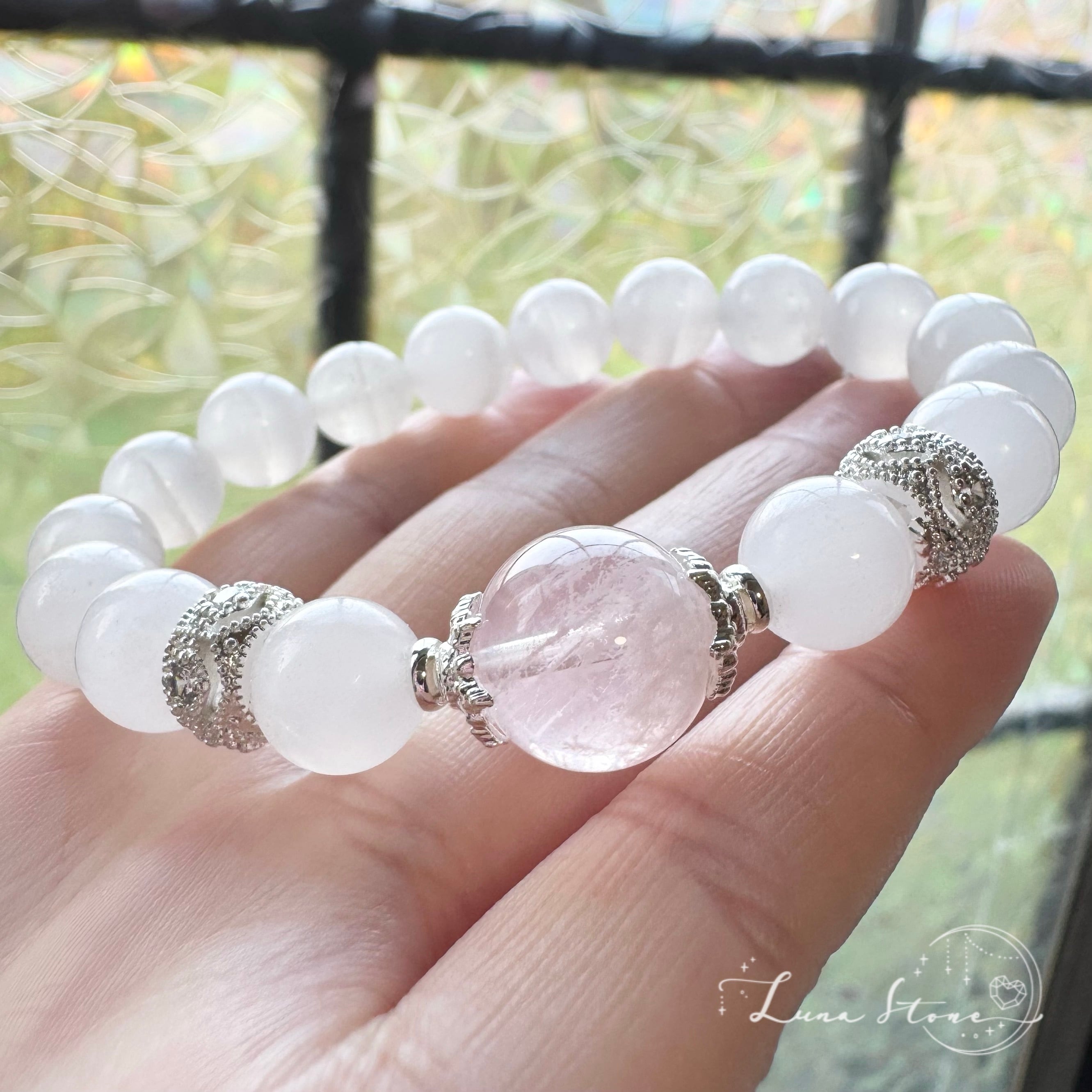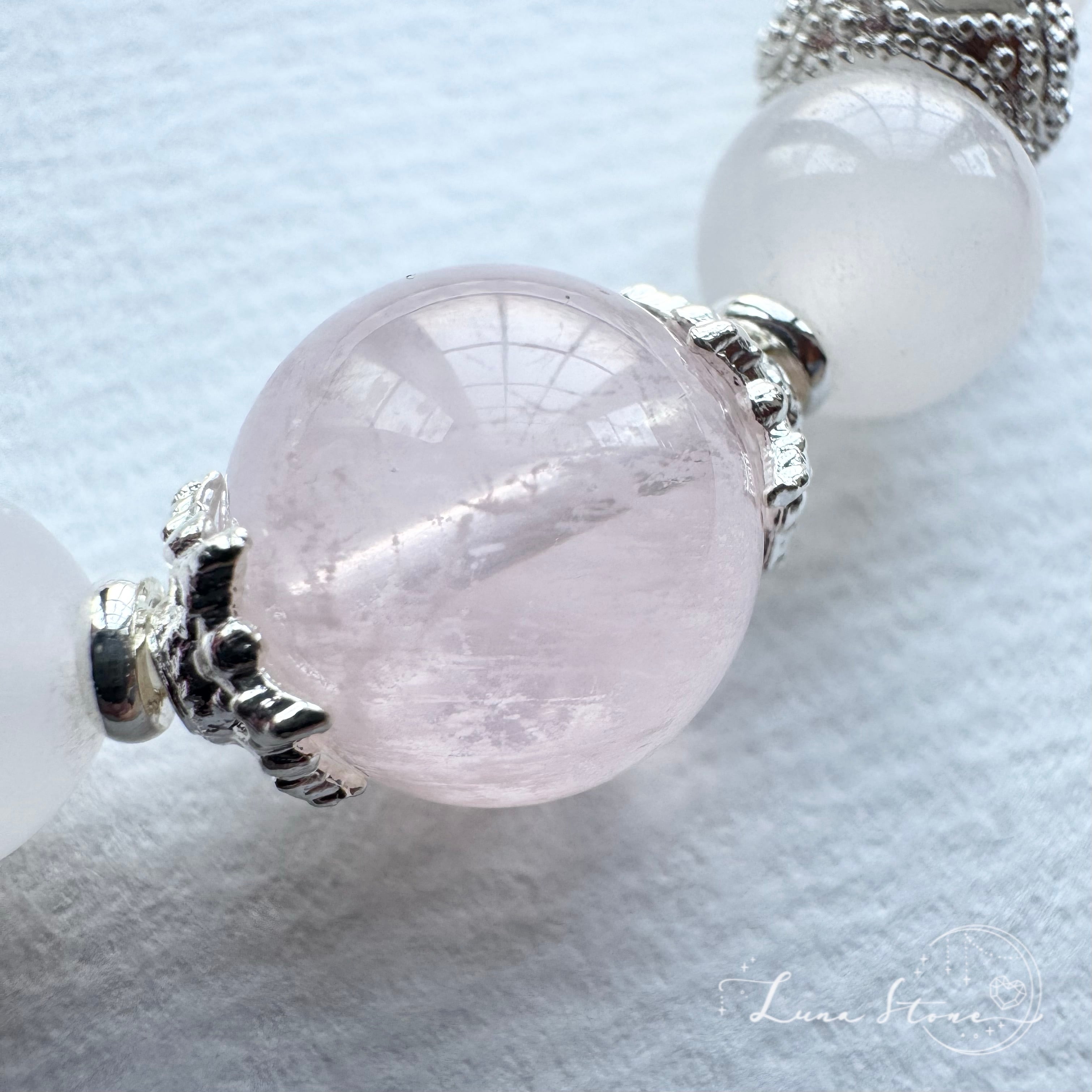 ほんのりとした桜色をたたえたセリサイトインローズクォーツをトップに、やわらかな乳白ピンクのピンクカルサイトを組み合わせた、優しい印象のブレスレットです。