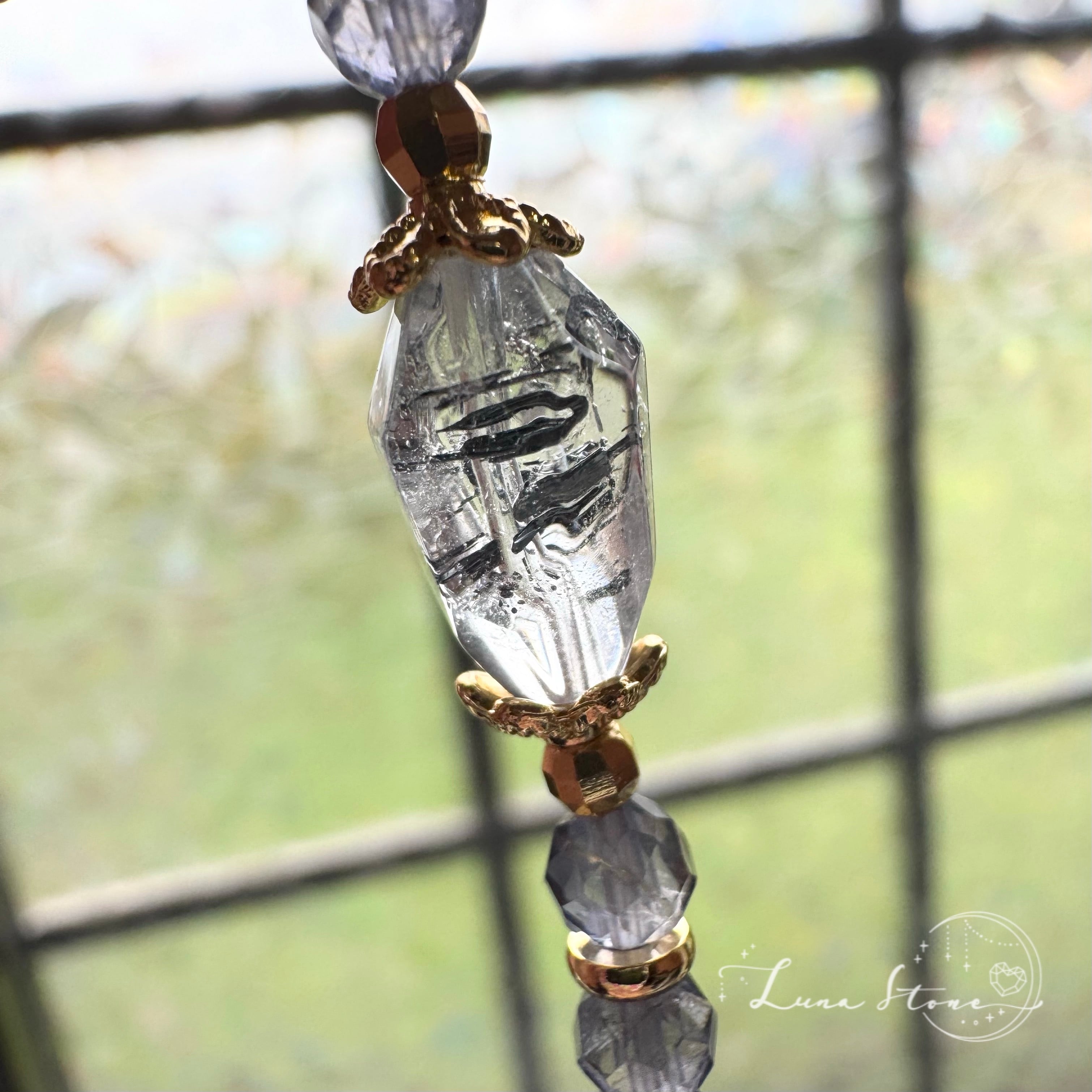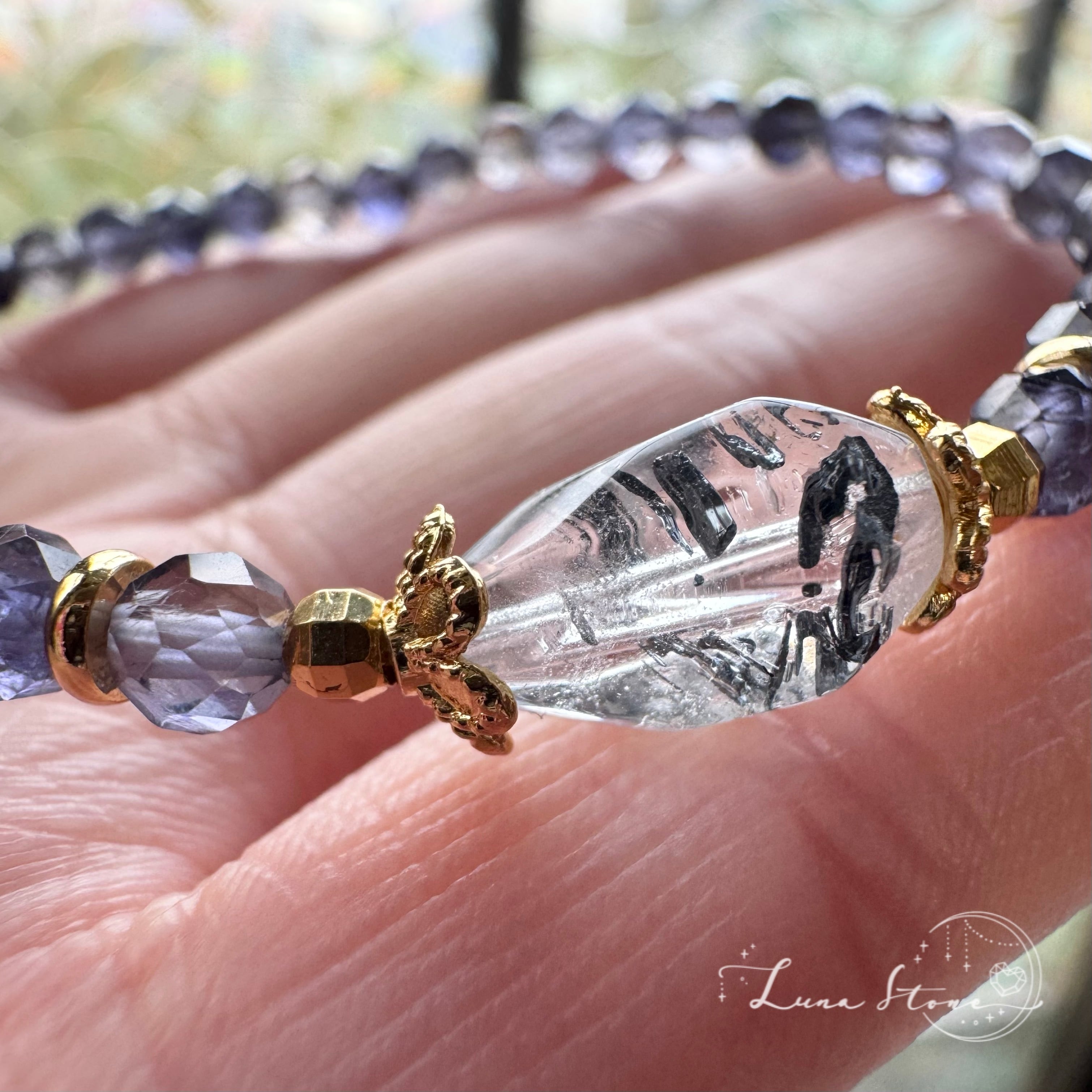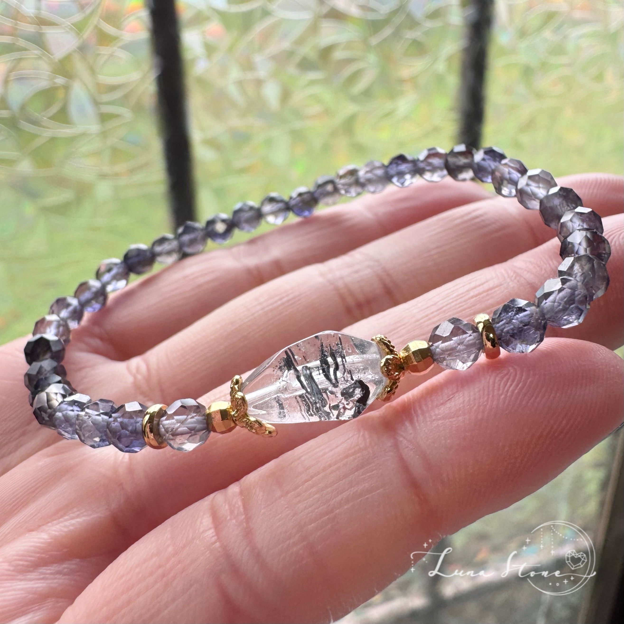 透明度の高いスティブナイトインクォーツをトップに、深みのある青紫が美しいアイオライトを繊細に連ねたブレスレットです。
