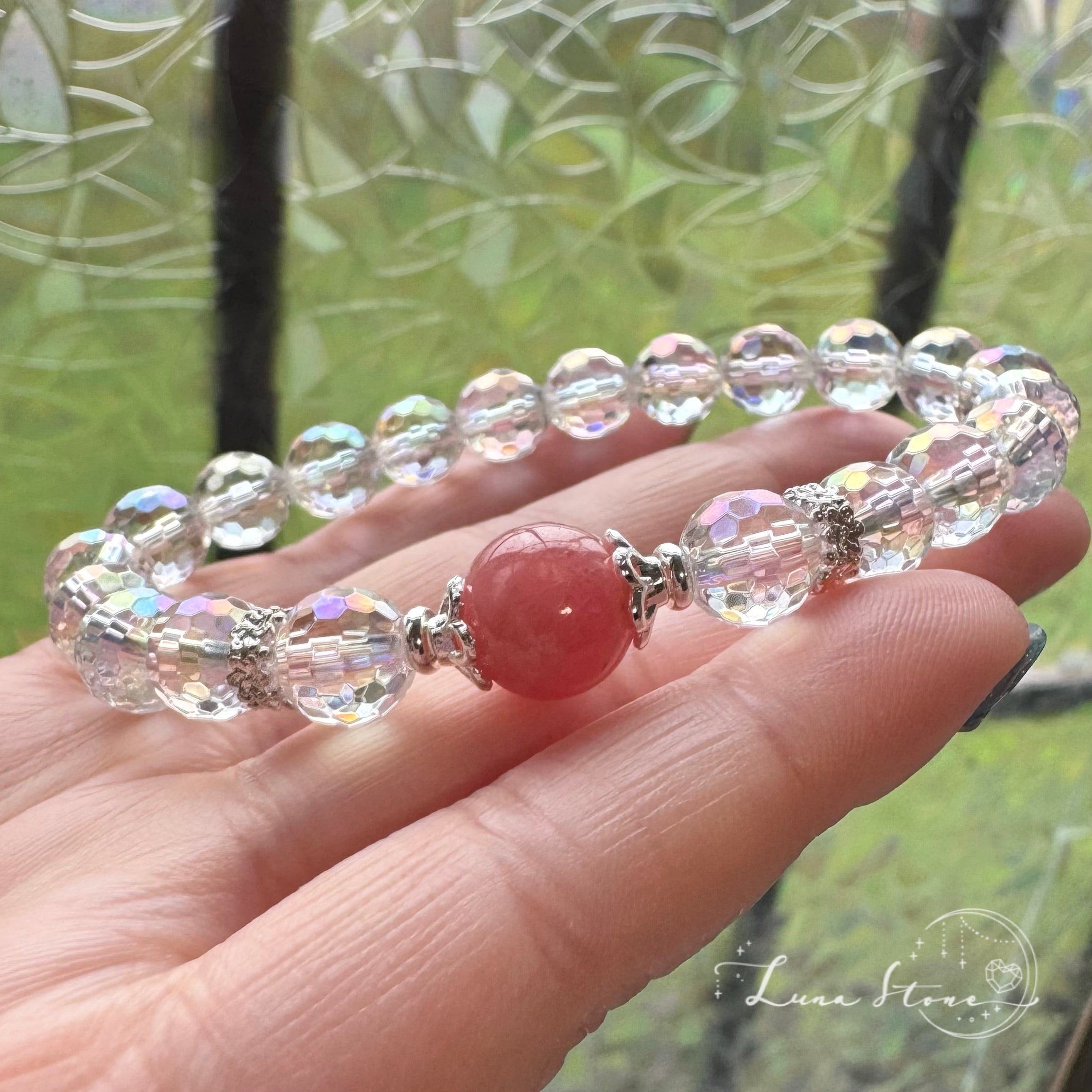 アクアオーラは、水晶の表面に特殊加工を施すことで生まれるクリアで軽やかな輝きが特徴で、角度によって淡い虹色の反射を楽しめます。